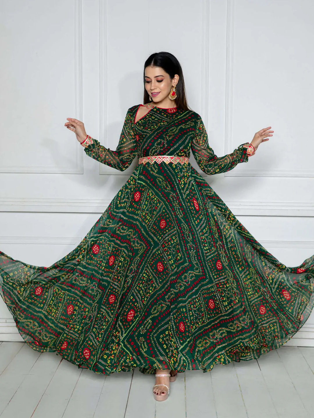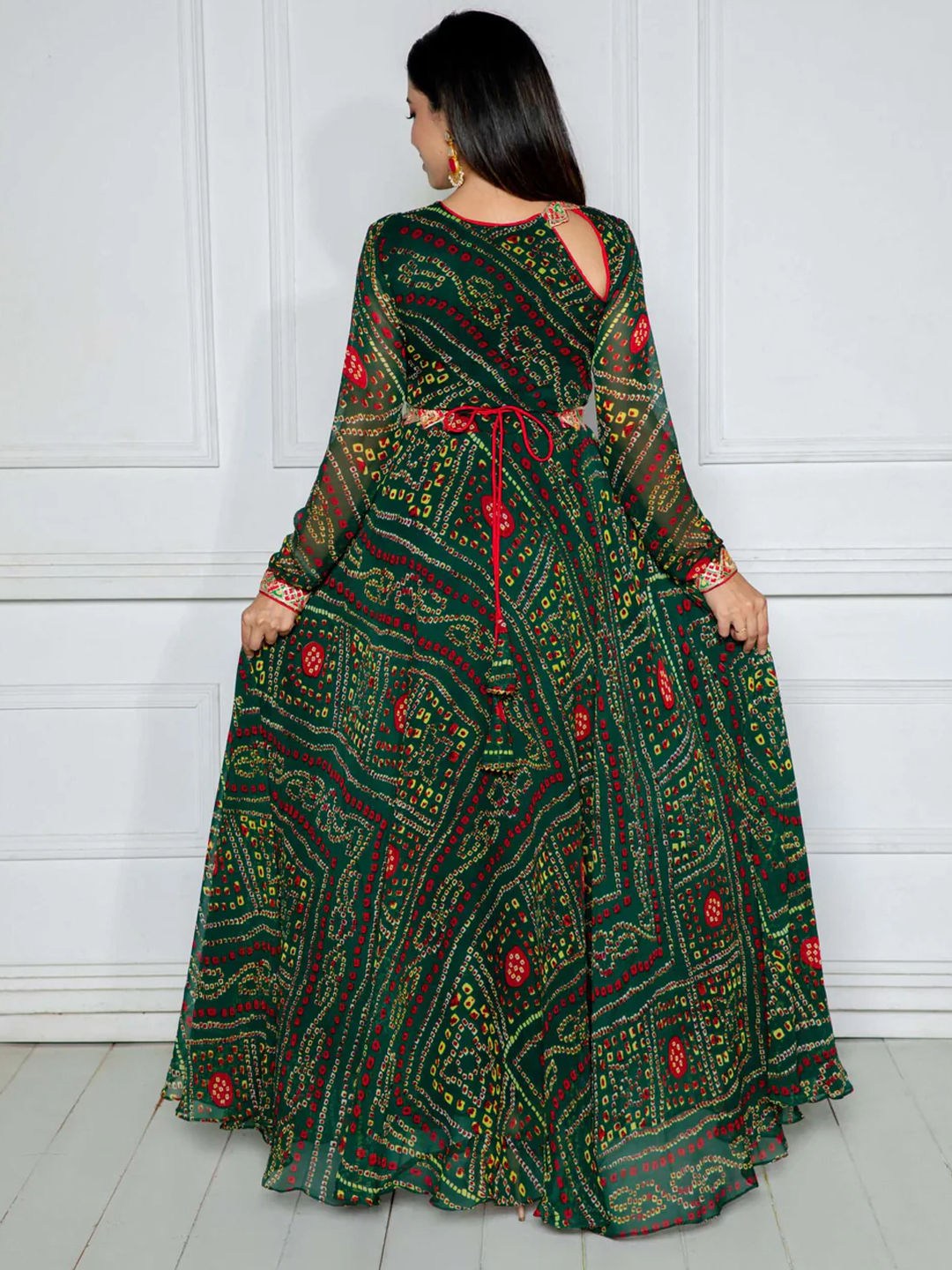 Green color Gown in Georgette fabric with Bandhej, Gota Patti work