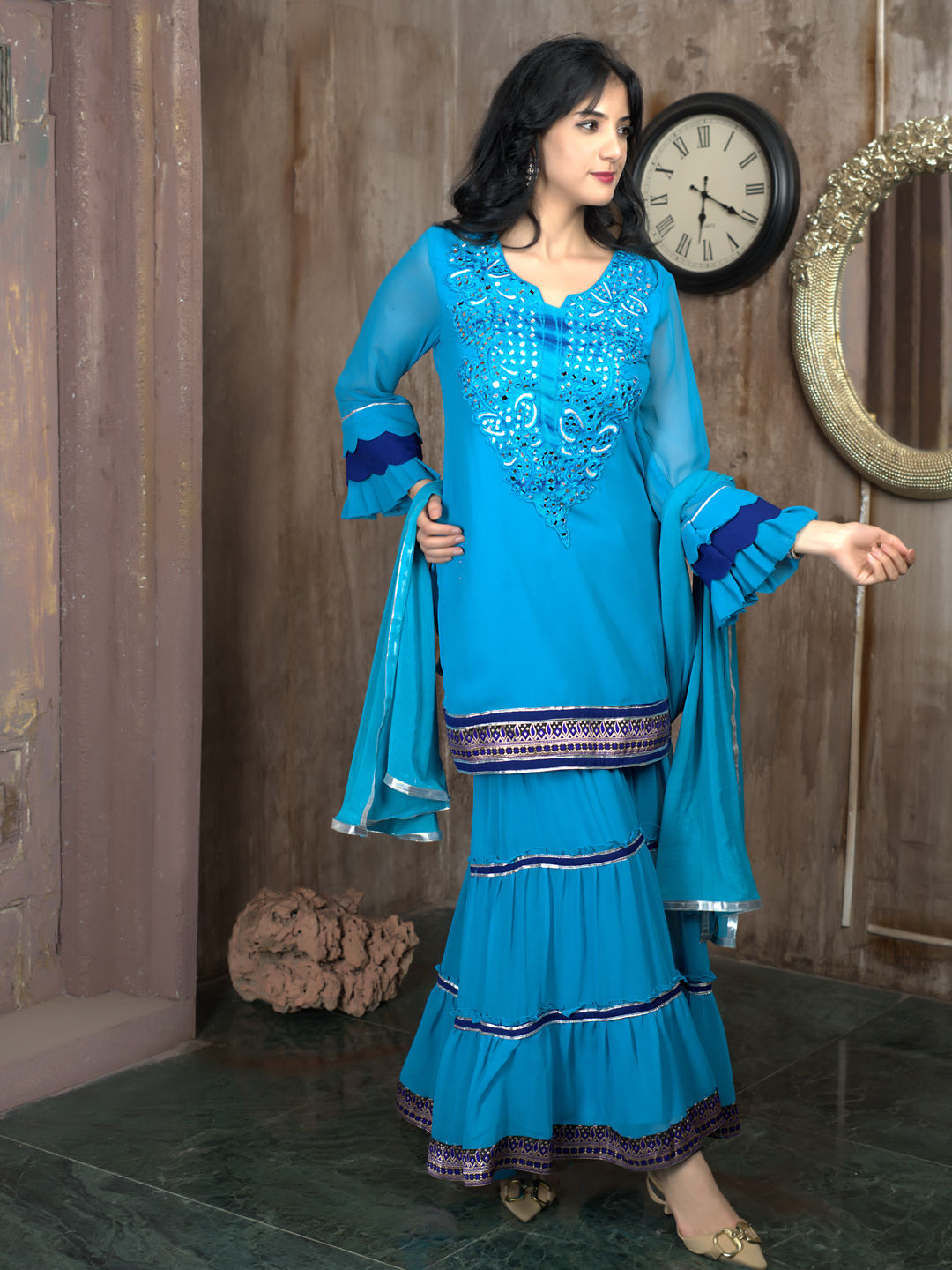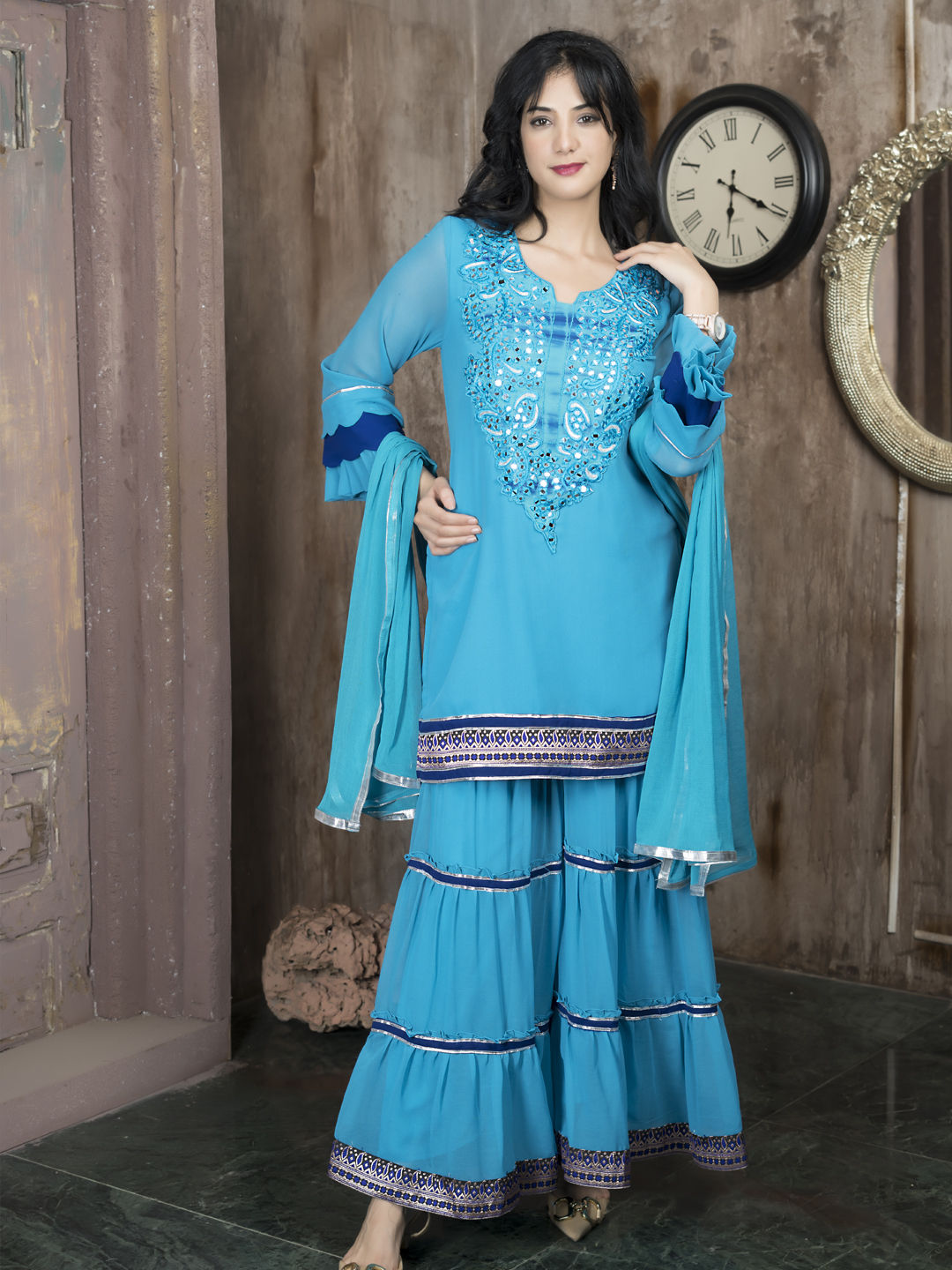 Blue color Salwar Kameez in Georgette fabric with Embroidered, Mirror work