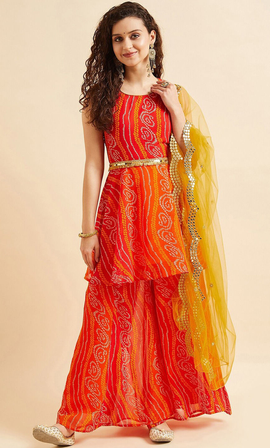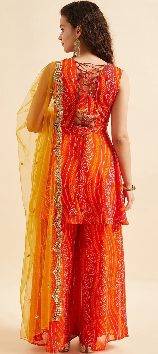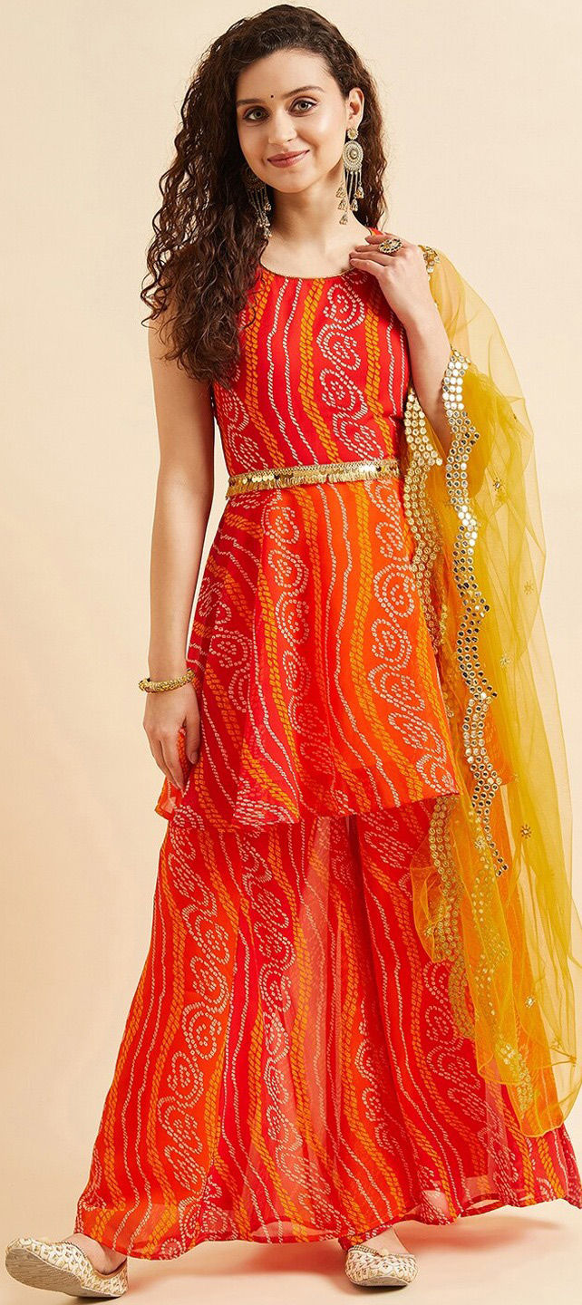Orange, Red and Maroon color Salwar Kameez in Georgette fabric with Bandhej, Printed work