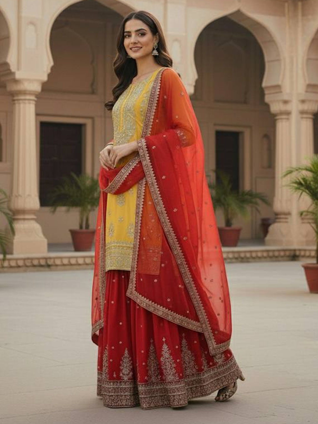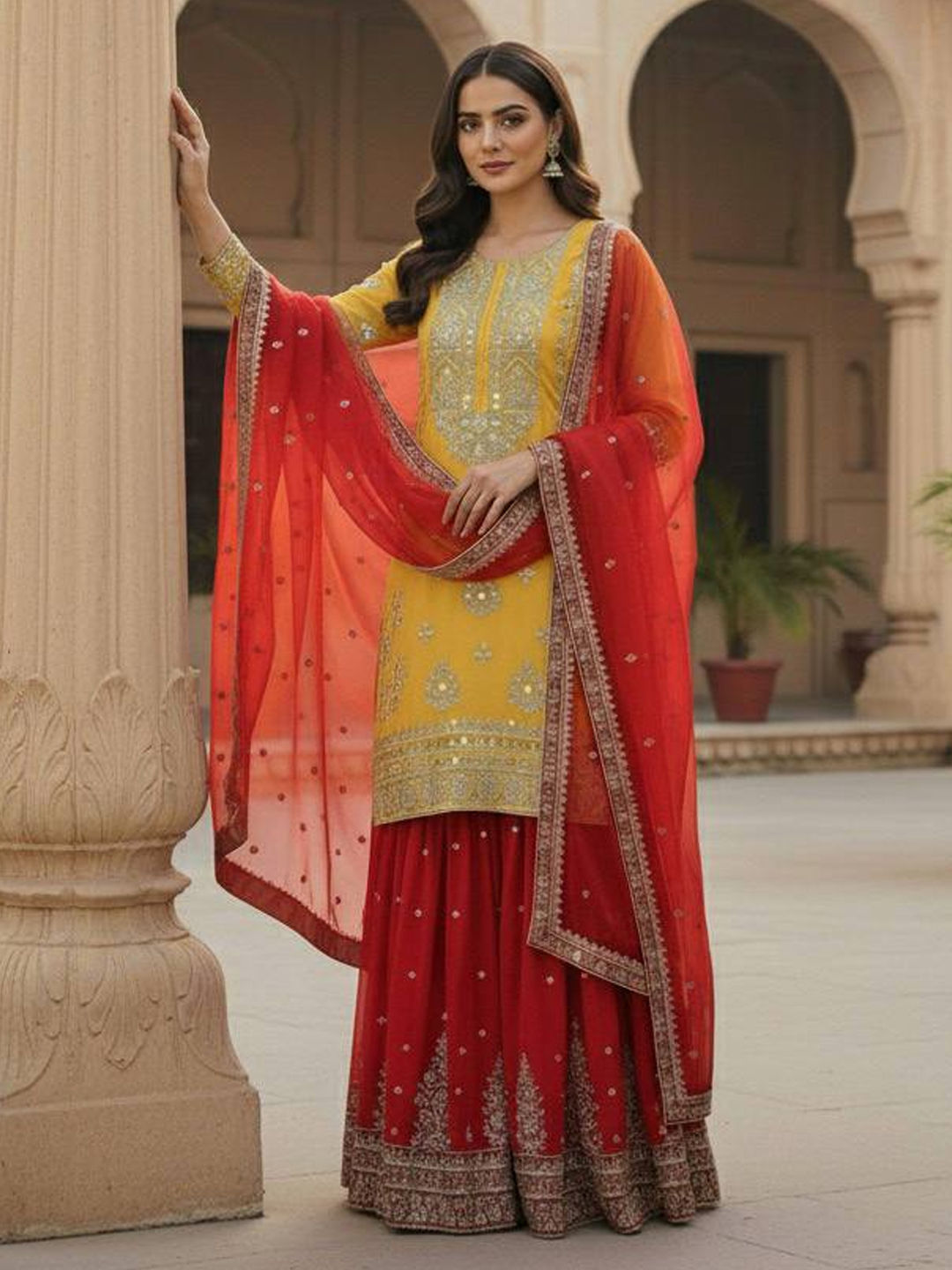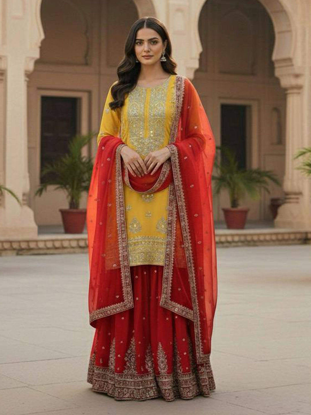 Yellow color Salwar Kameez in Georgette fabric with Embroidered, Sequence work