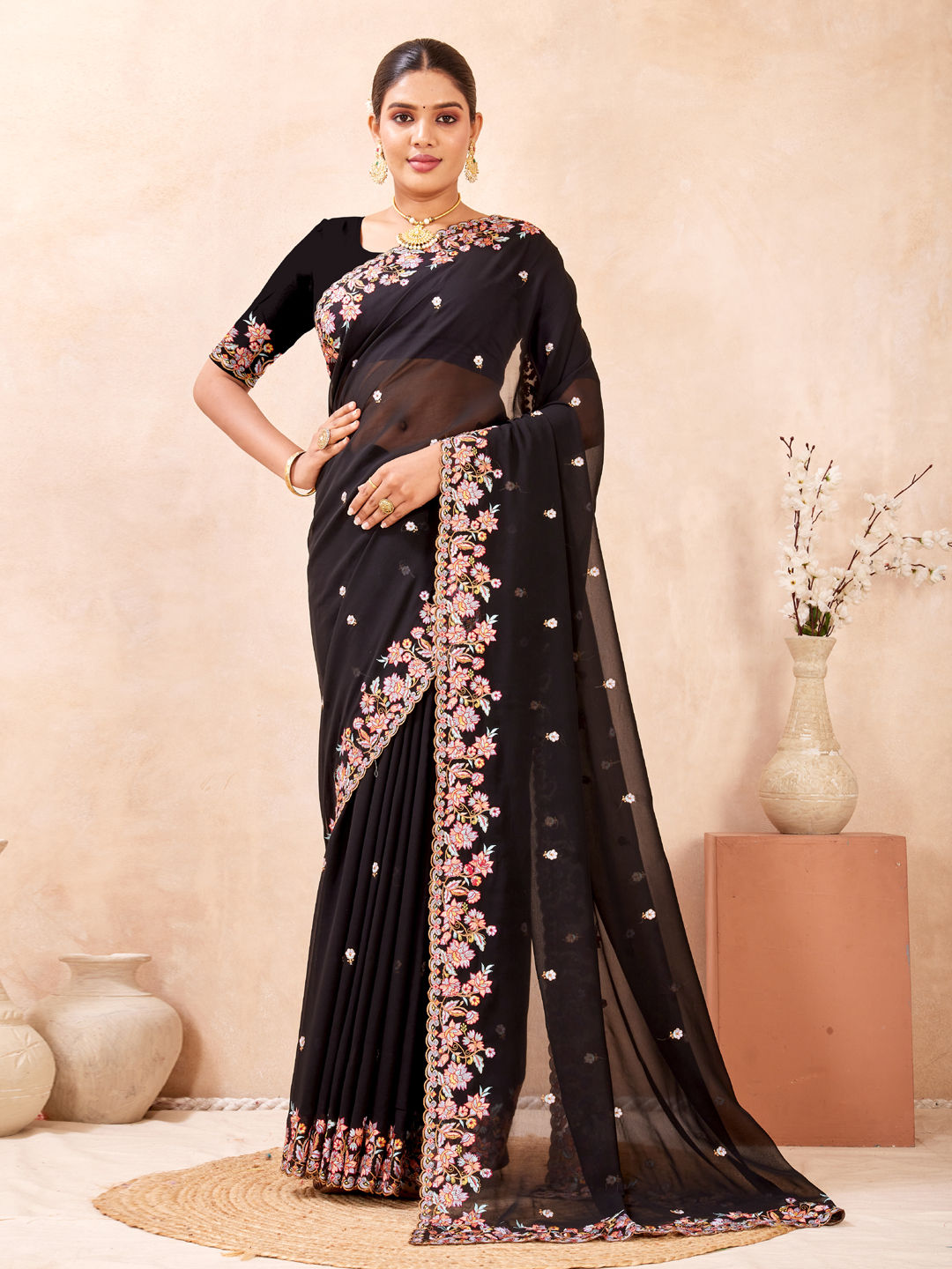 Black and Grey color Saree in Georgette fabric with Embroidered, Resham work