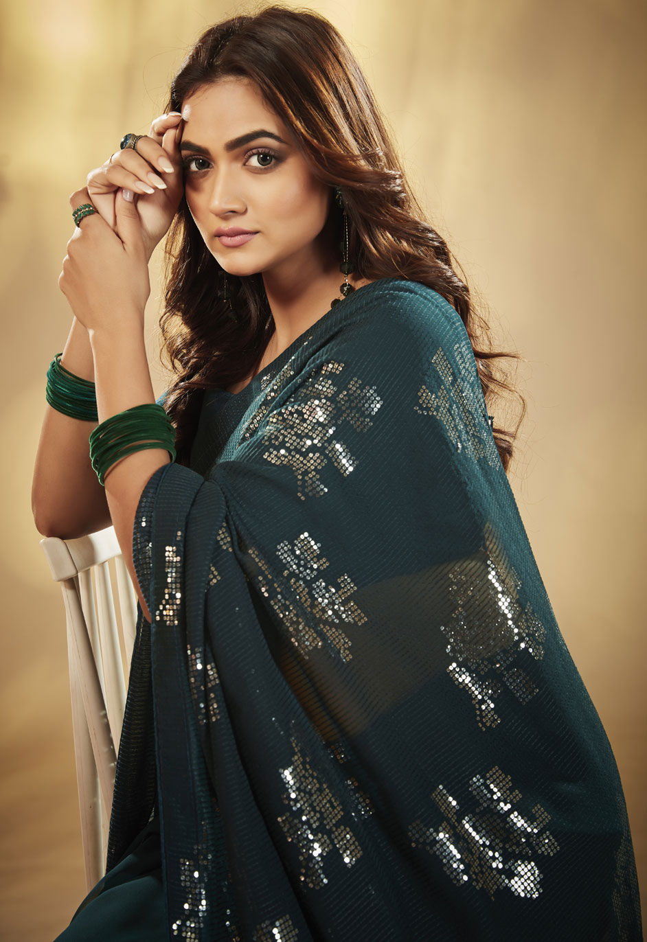 Blue color Saree in Georgette fabric with Embroidered, Sequence, Thread work