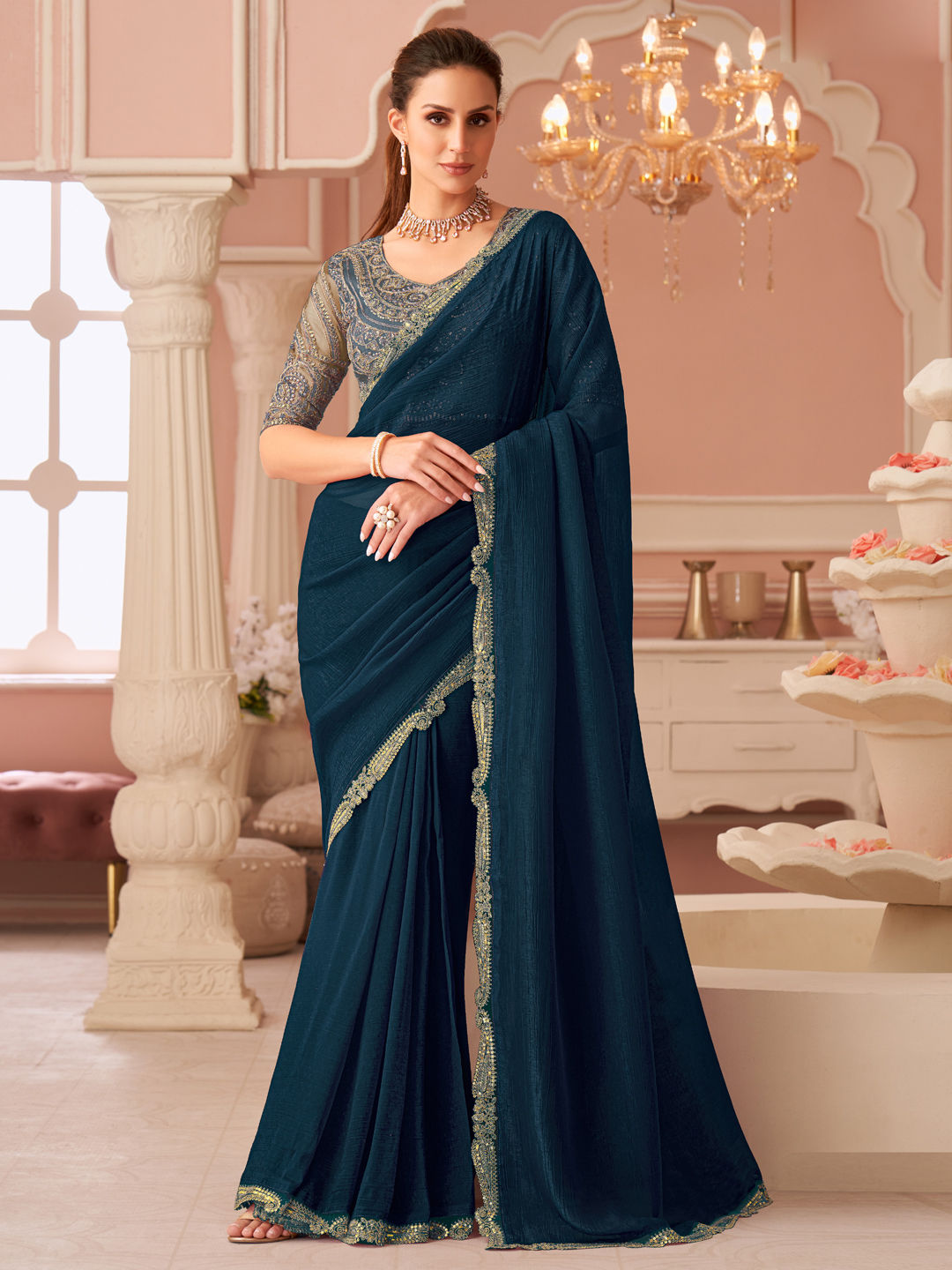 Blue color Saree in Georgette fabric with Embroidered, Lace work