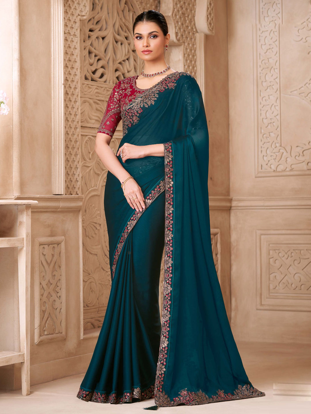 Satin Silk Reception Saree in Red and Maroon with Sequence work