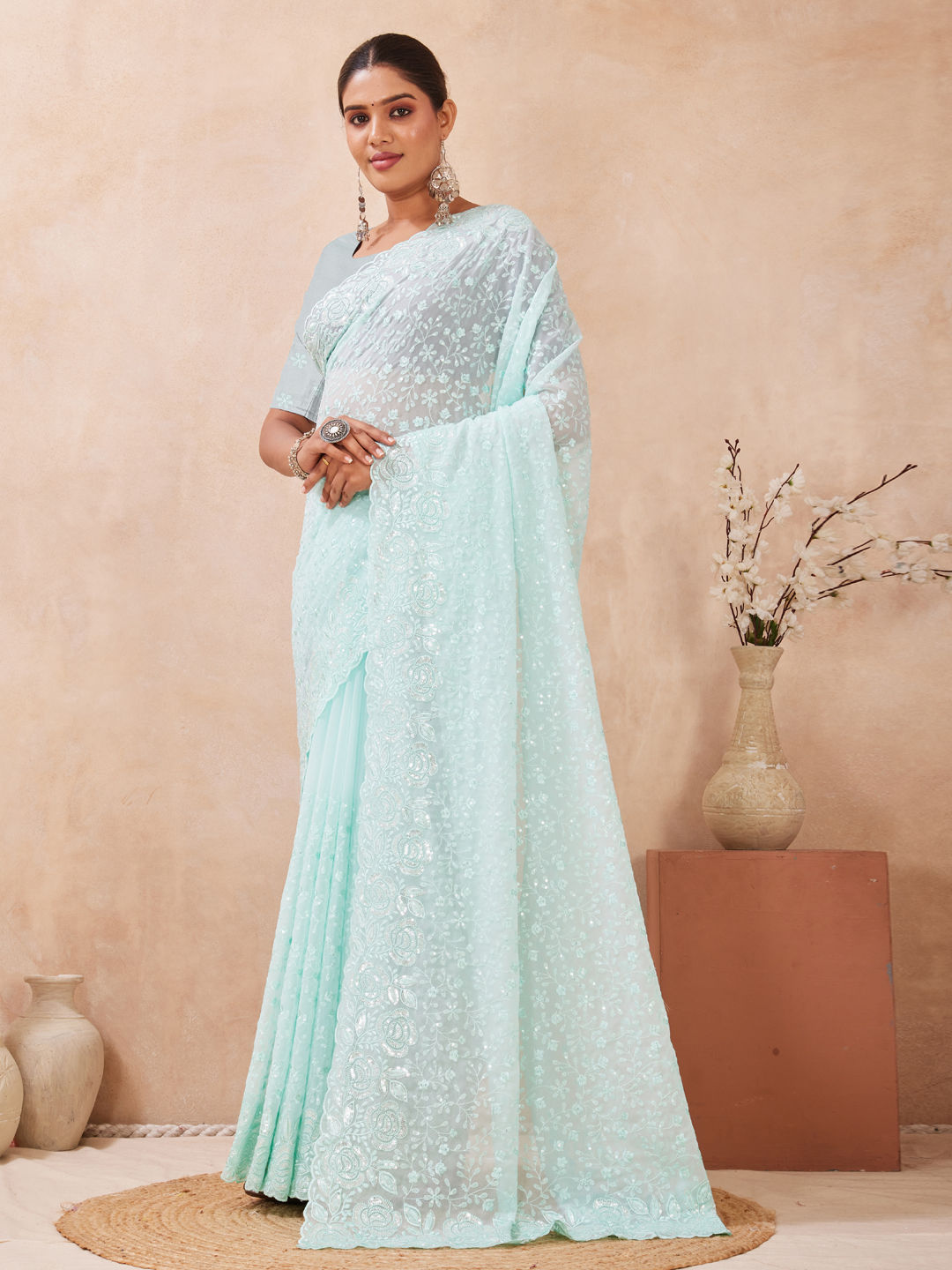 Blue color Saree in Georgette fabric with Embroidered, Resham, Sequence work