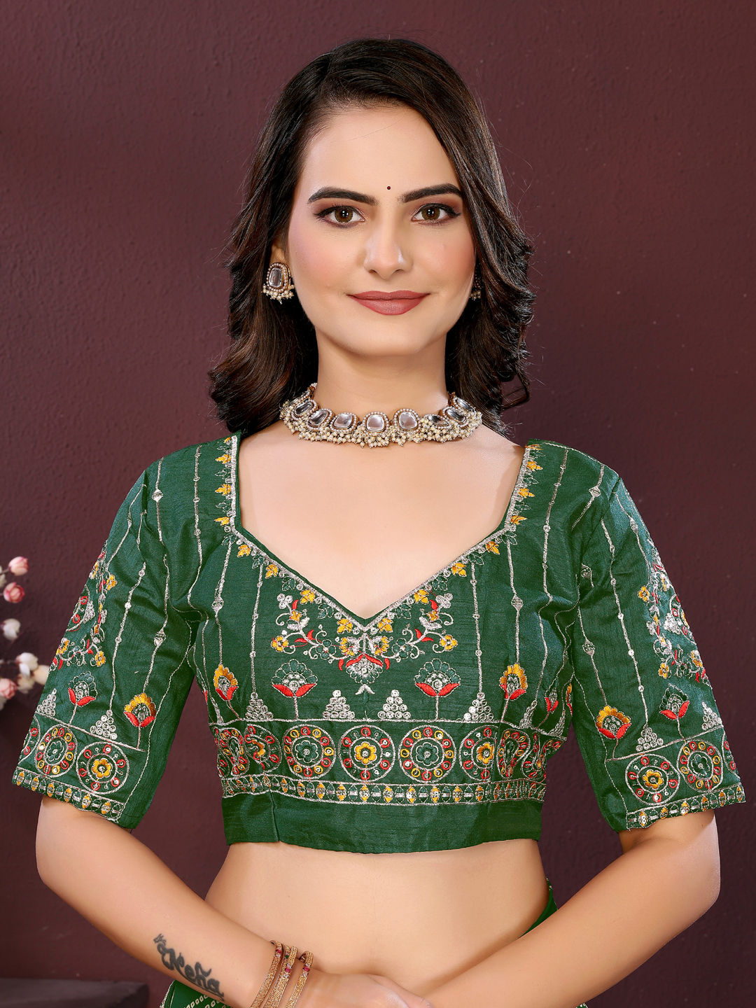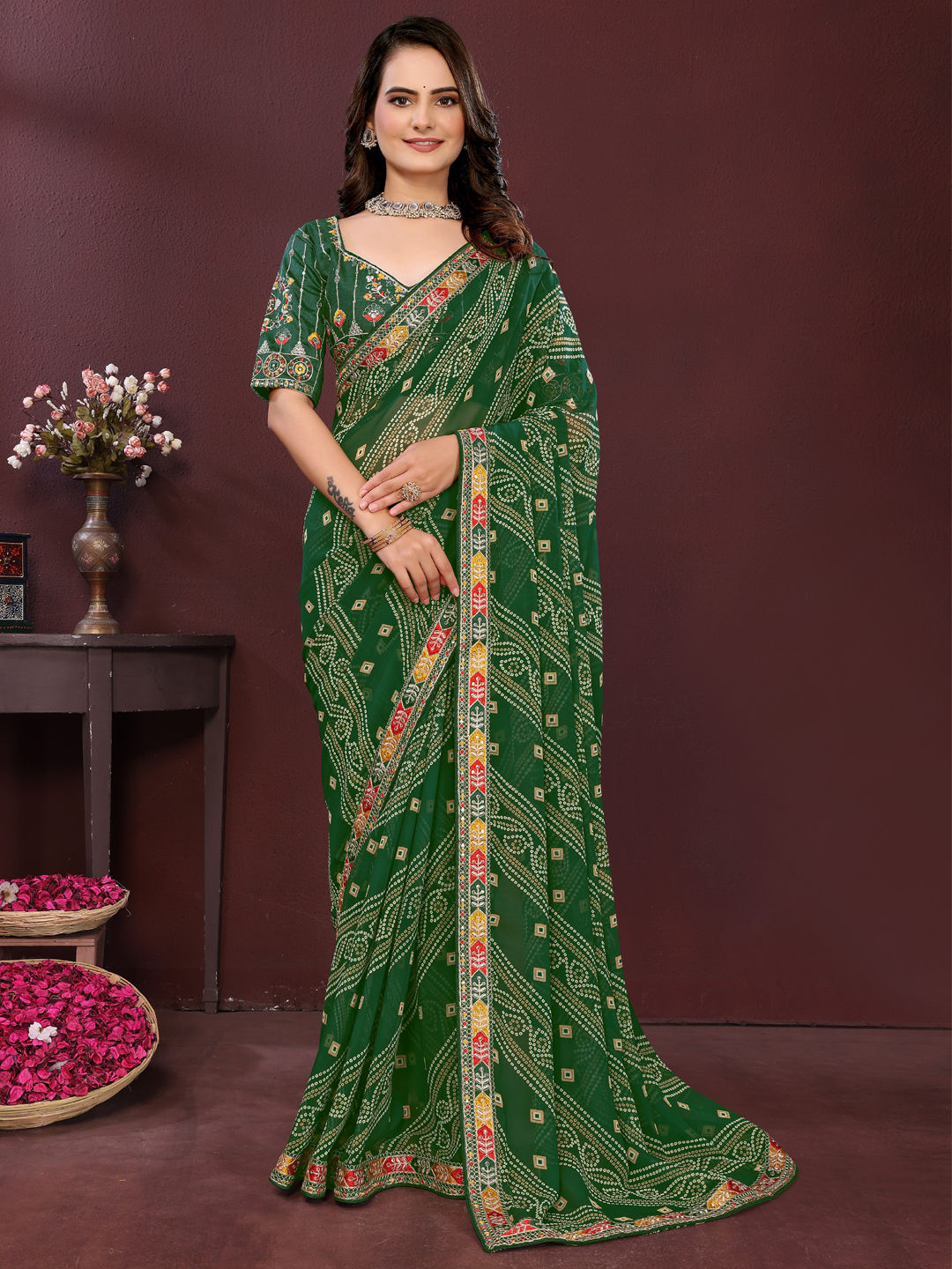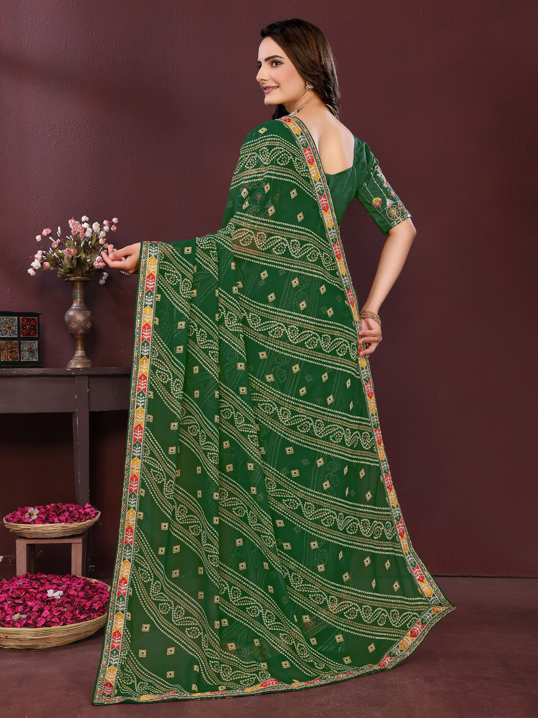 Green color Saree in Georgette fabric with Bandhej, Border, Digital Print, Embroidered work