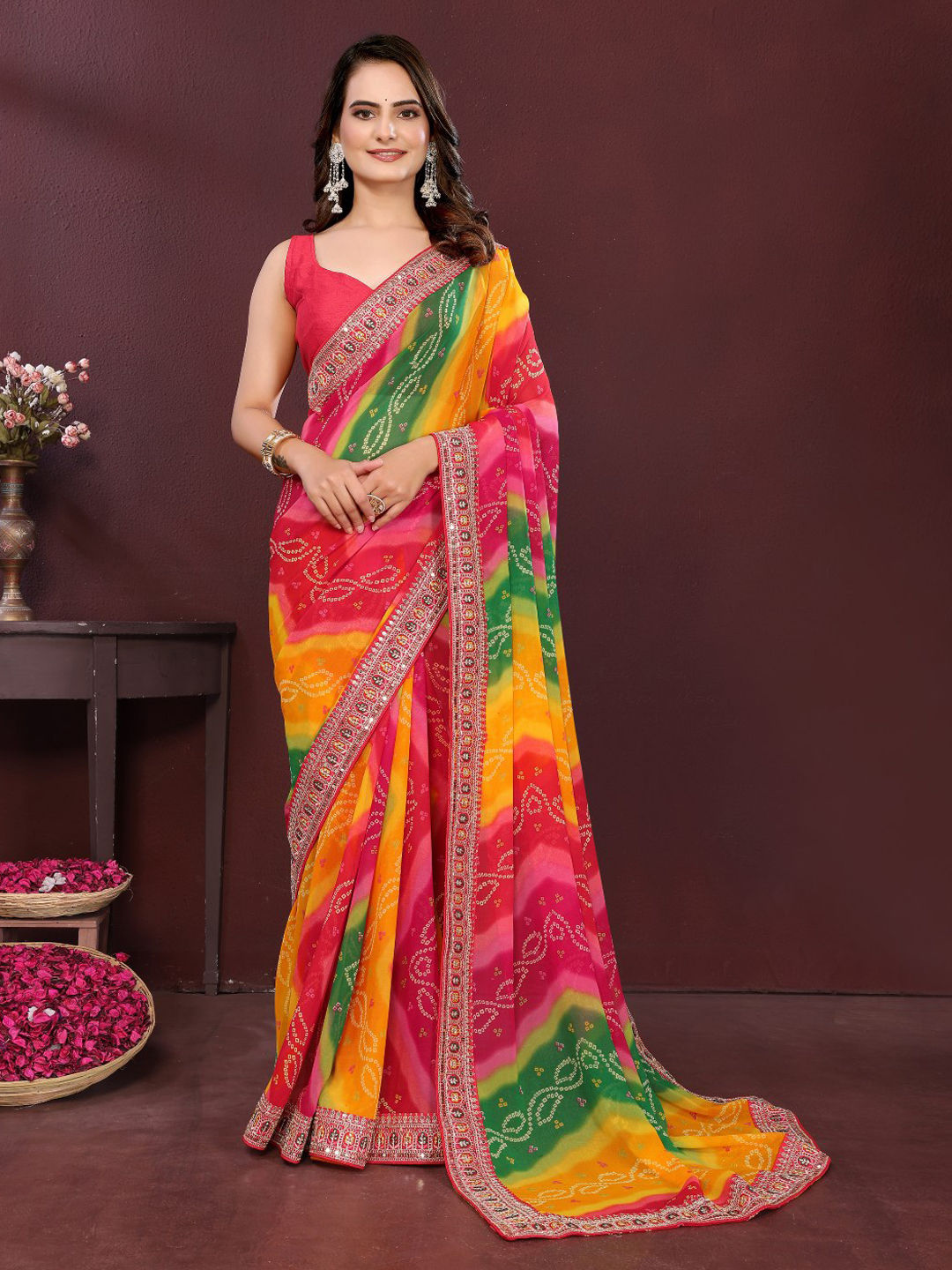 Multicolor color Saree in Georgette fabric with Bandhej, Border, Printed work