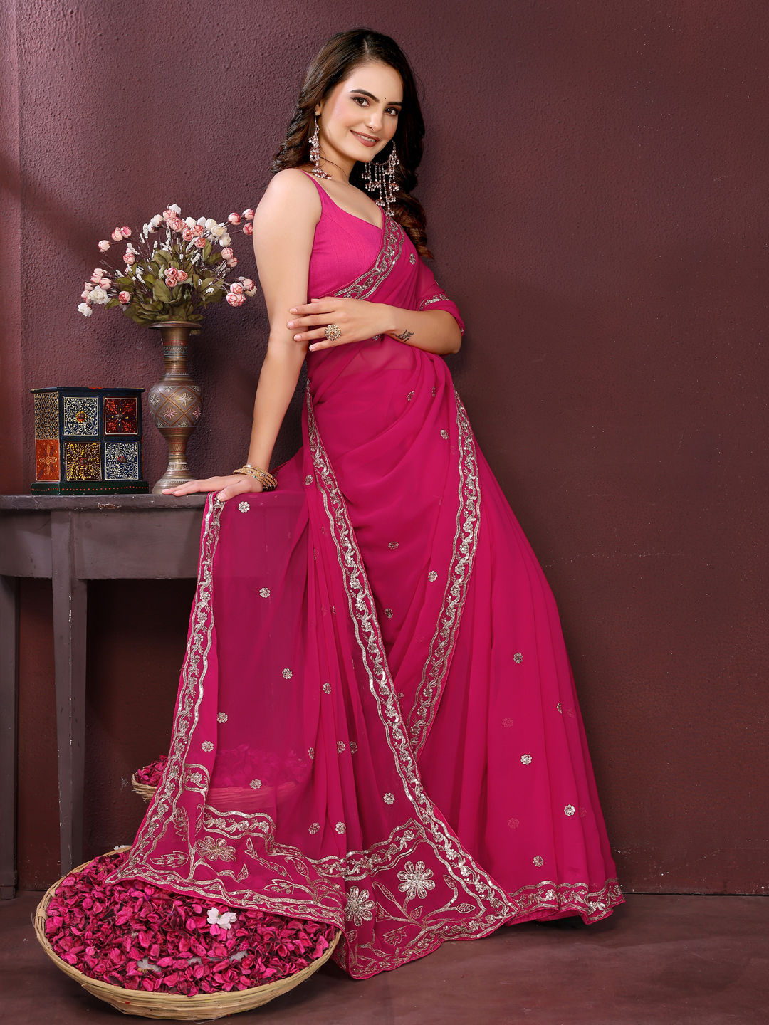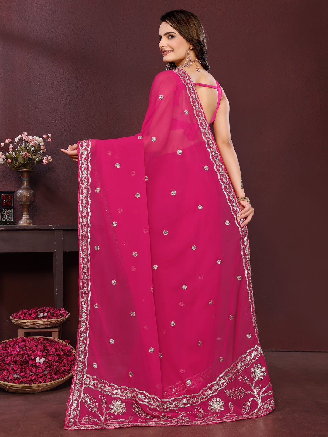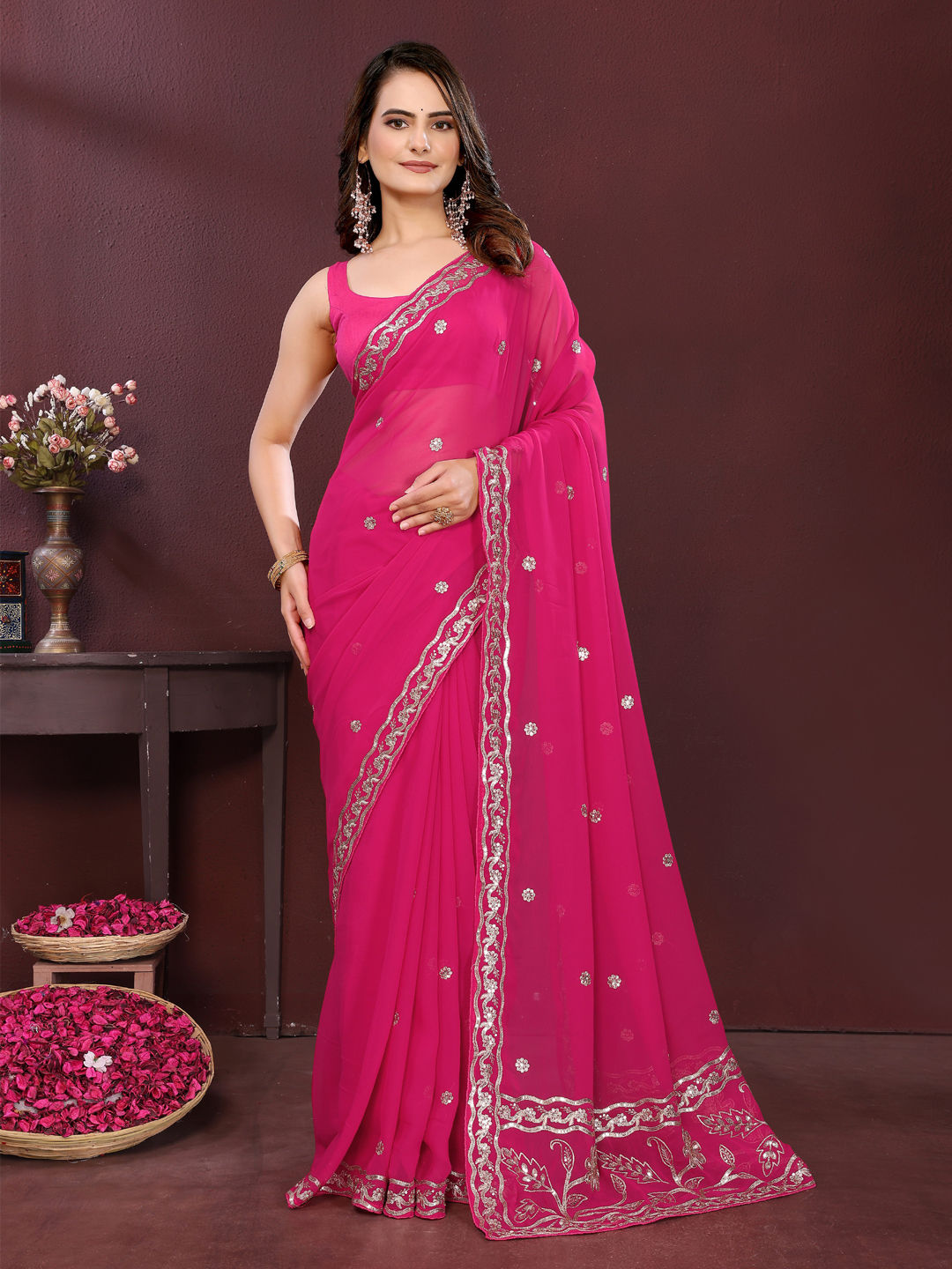 Georgette Festive Saree in Pink and Majenta with Embroidered work