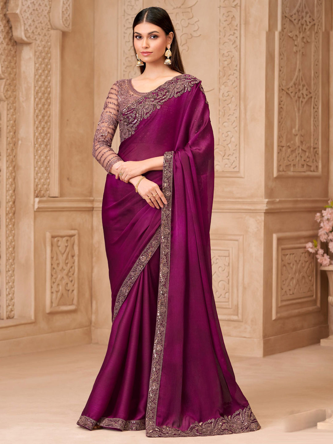 Pink and Majenta color Saree in Georgette fabric with Embroidered, Sequence work