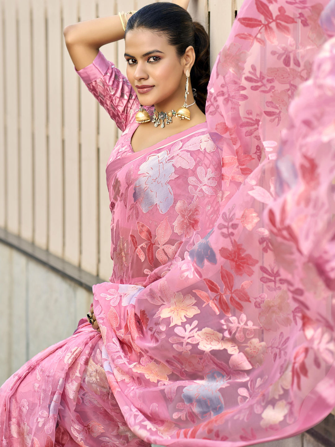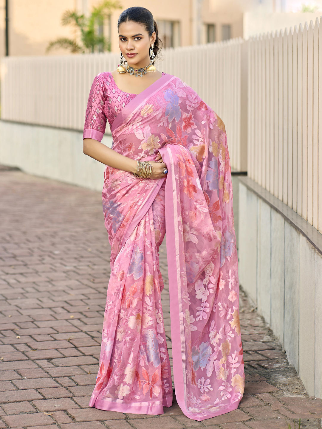 Pink and Majenta color Saree in Georgette fabric with Floral, Printed, Weaving work