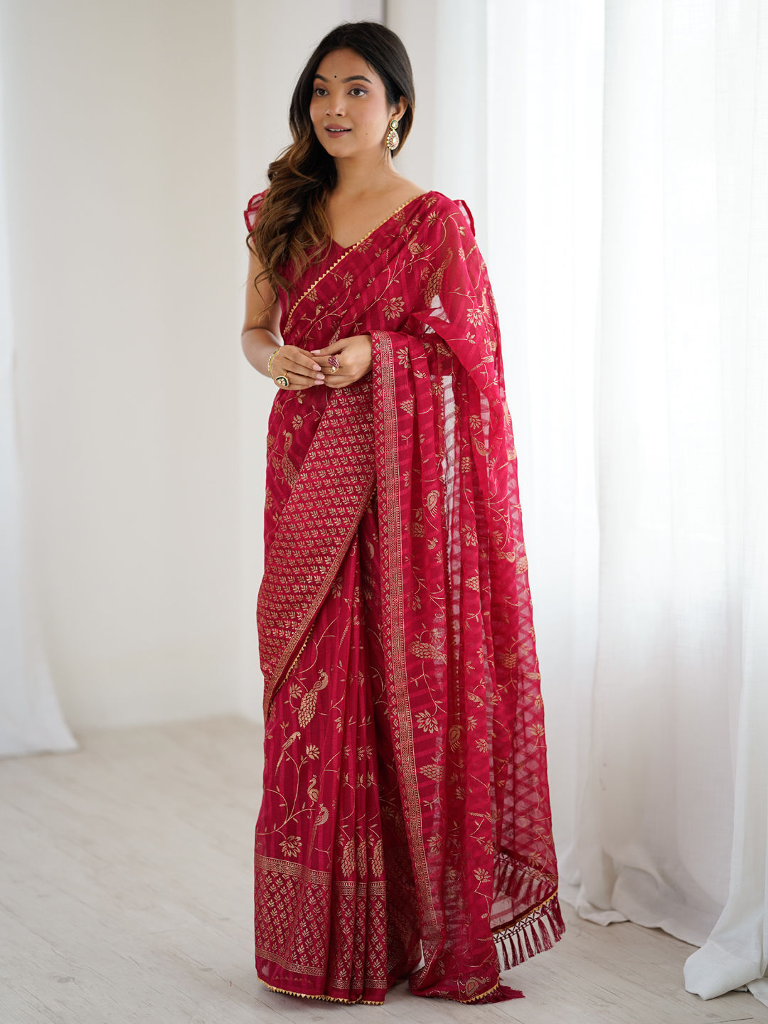 Georgette Festive Saree in Red and Maroon with Foil Print work