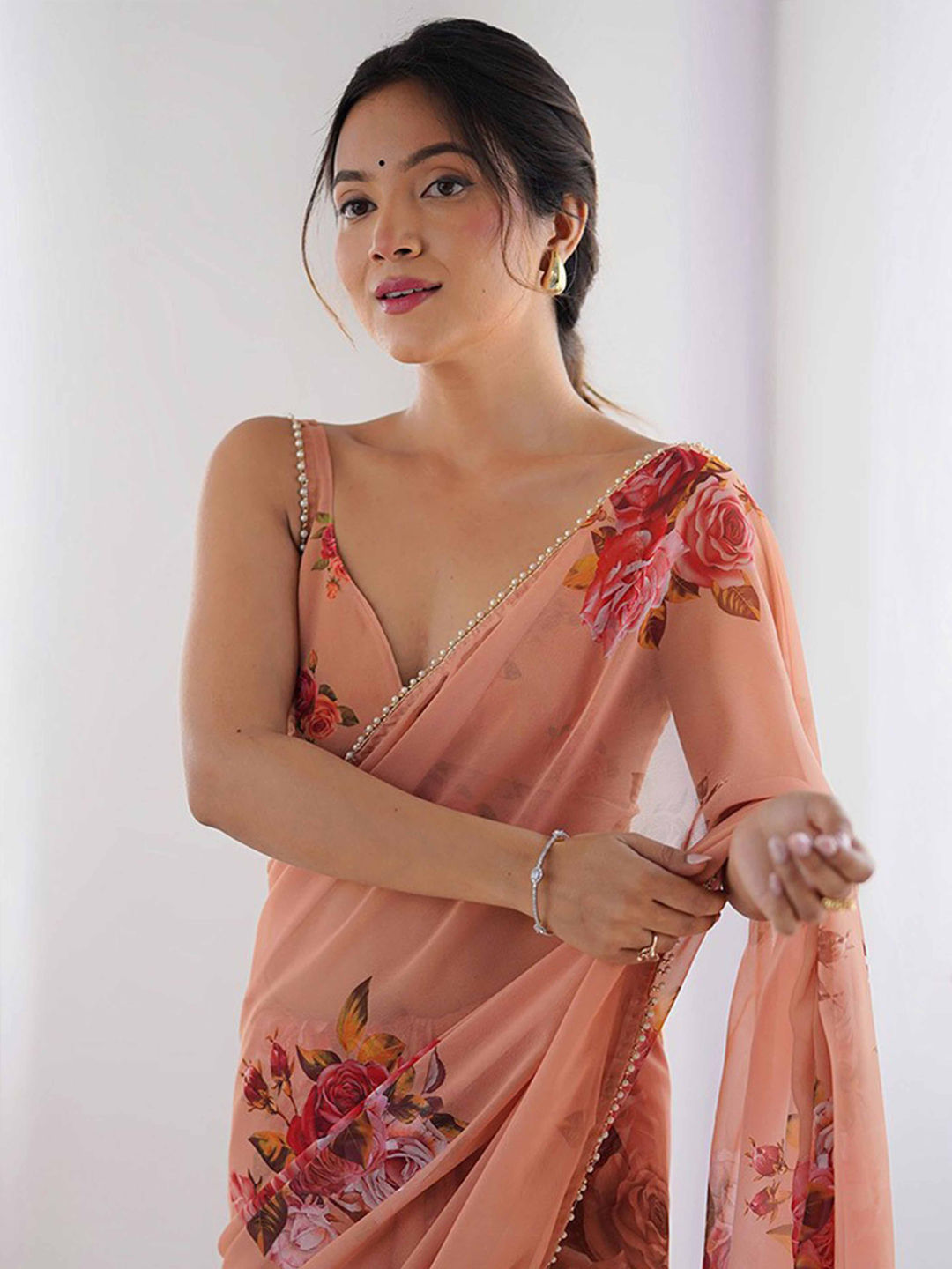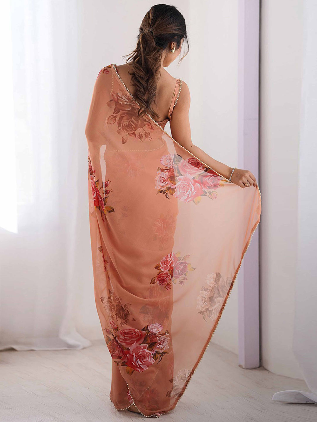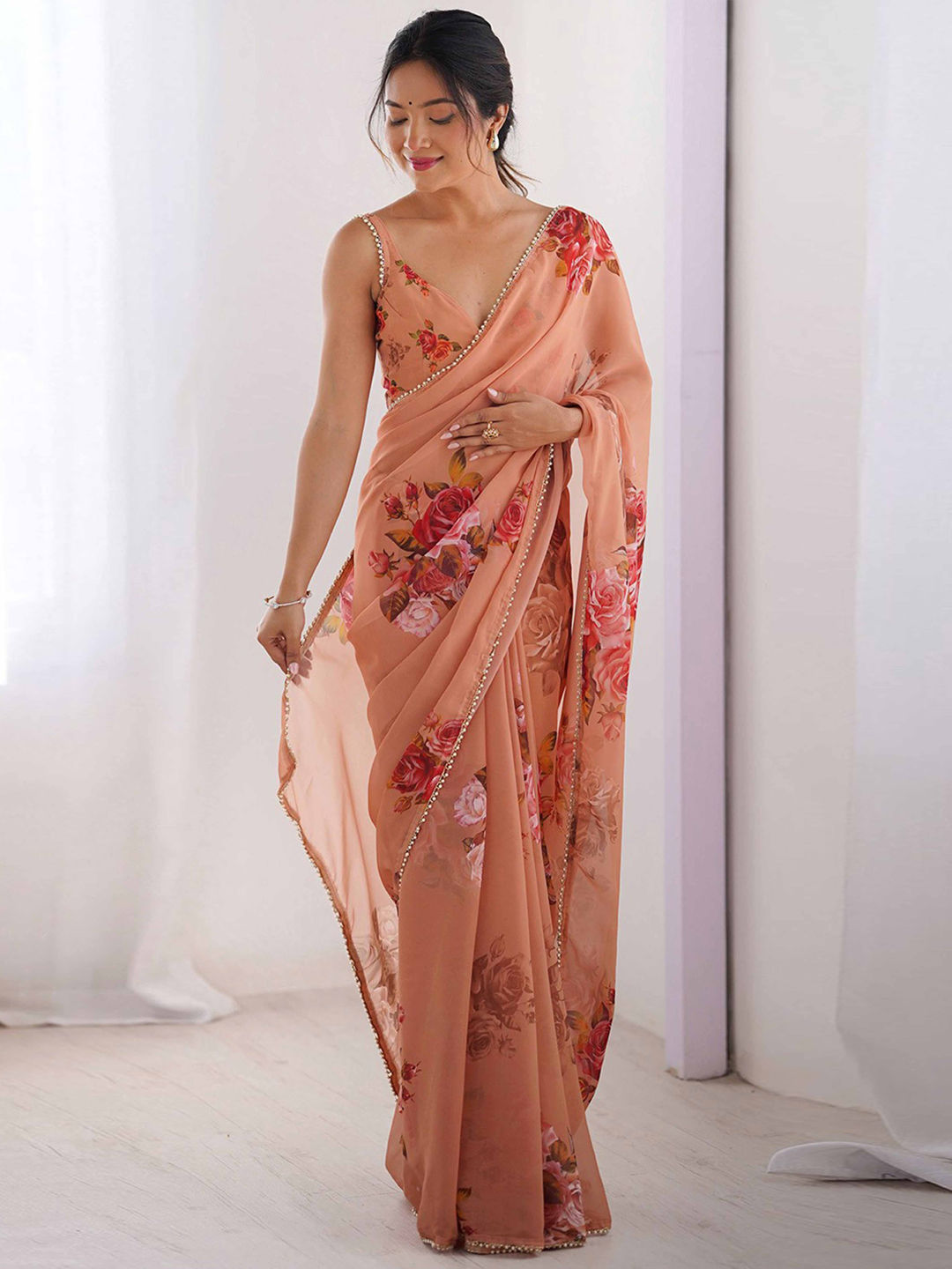 Pink and Majenta color Saree in Georgette fabric with Floral, Lace, Printed work