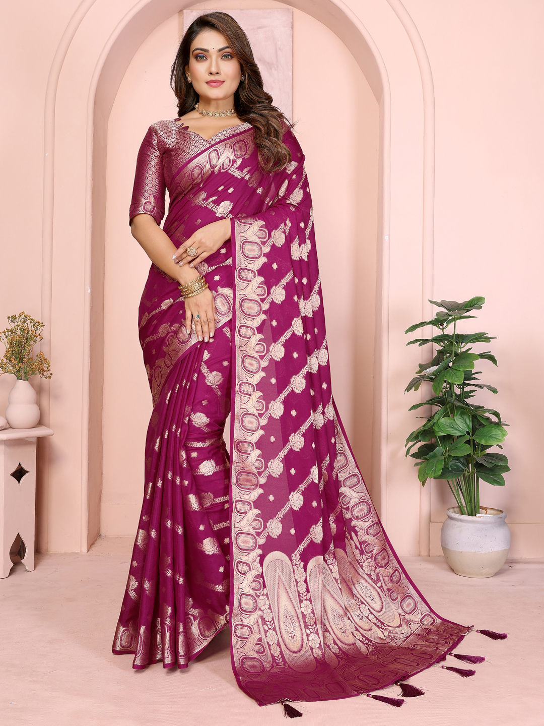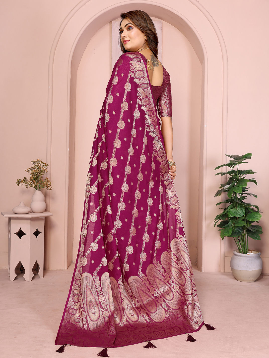 Georgette Festive Saree in Pink and Majenta with Weaving work