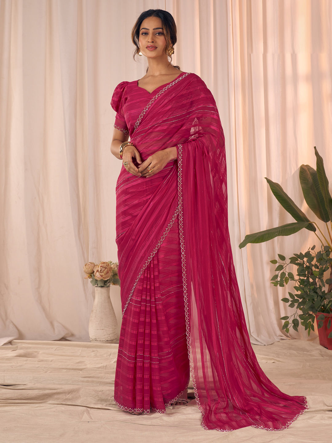 Pink and Majenta color Saree in Georgette fabric with Zircon work