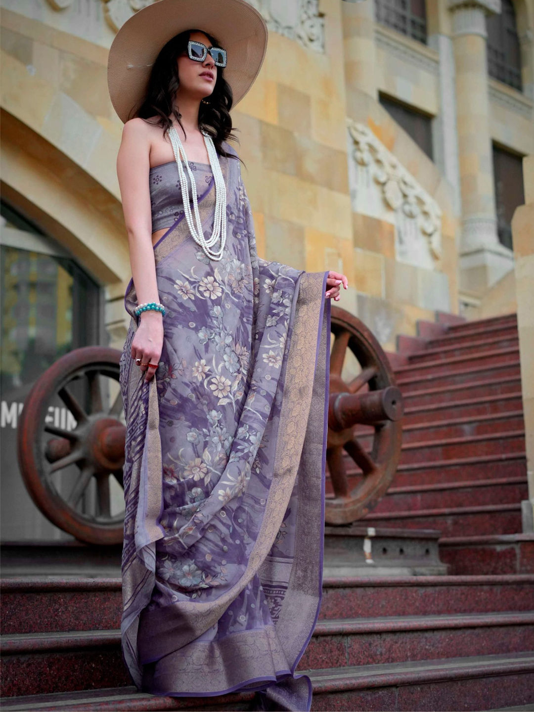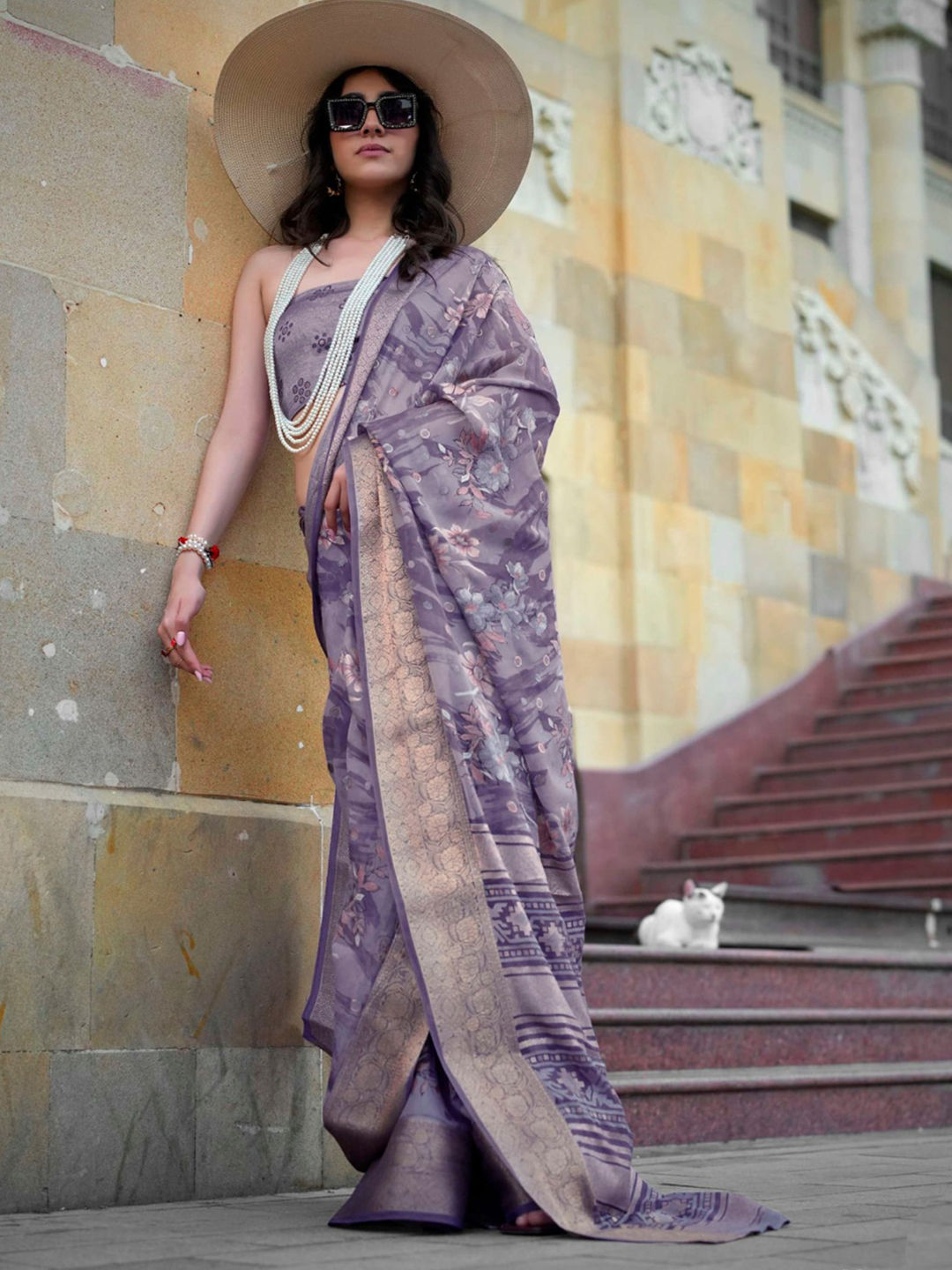 Purple and Violet color Saree in Georgette fabric with Floral, Printed work