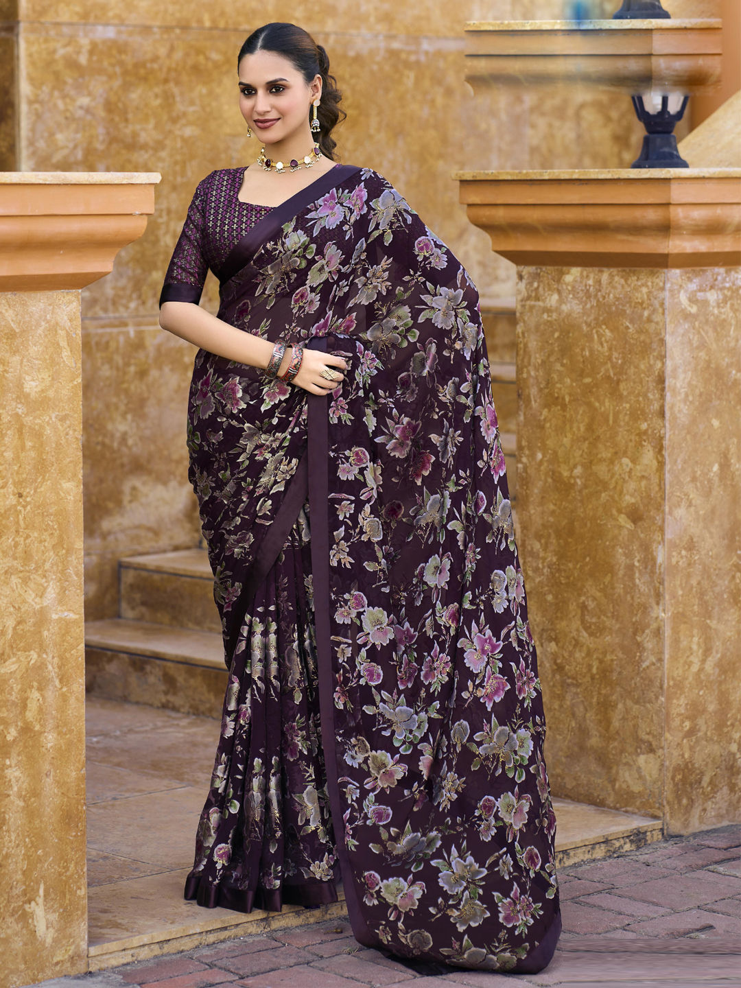 Purple and Violet color Saree in Georgette fabric with Floral, Weaving work
