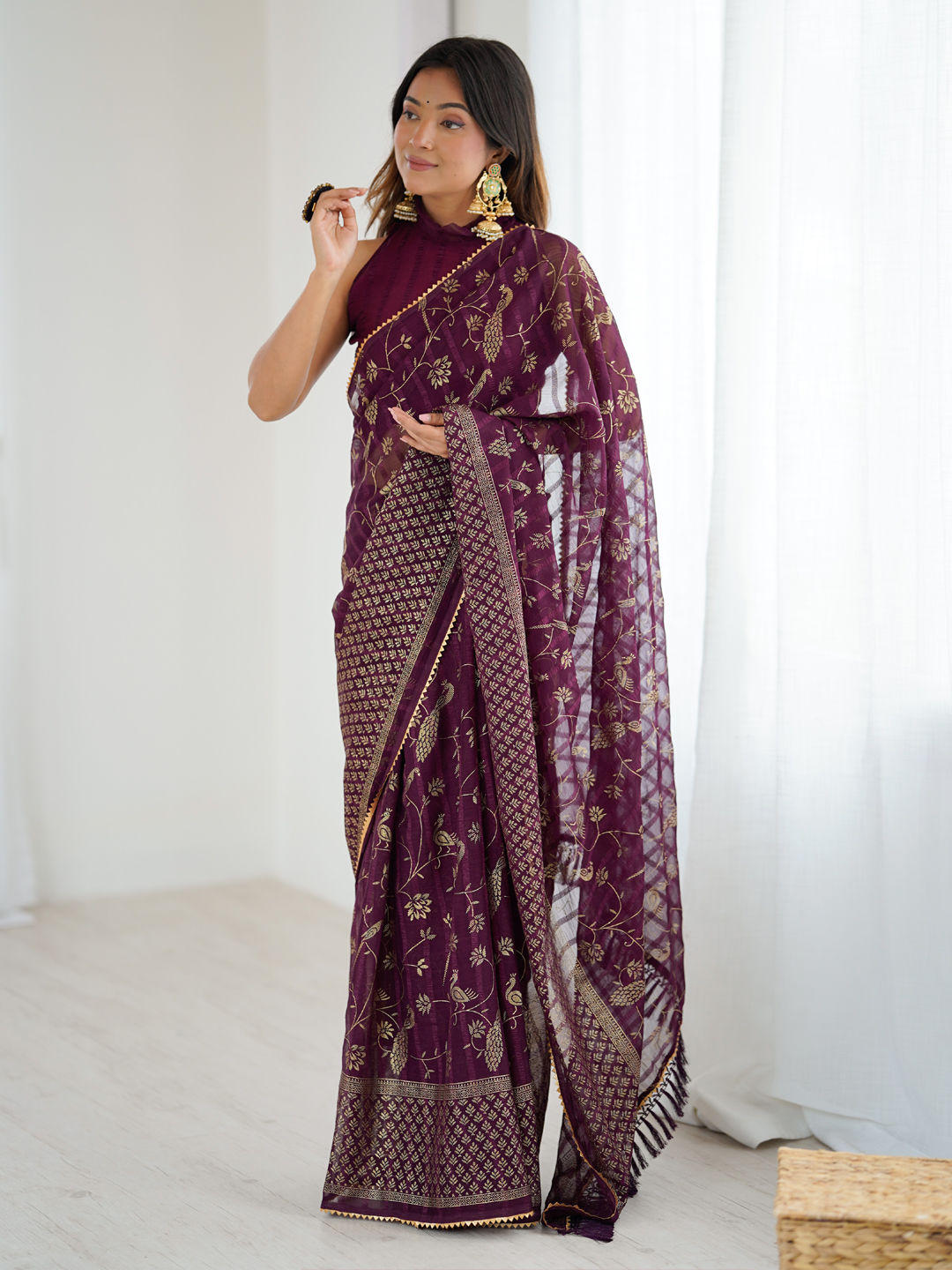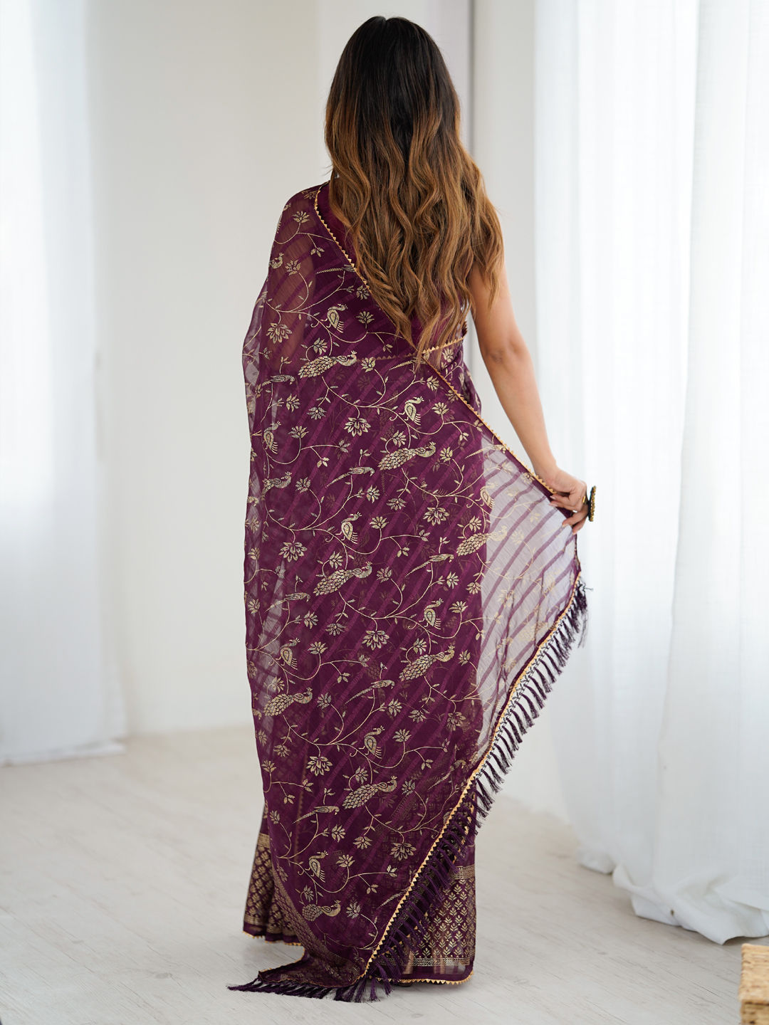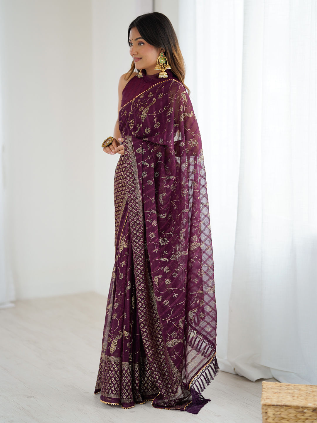 Purple and Violet color Saree in Georgette fabric with Foil Print, Lace work