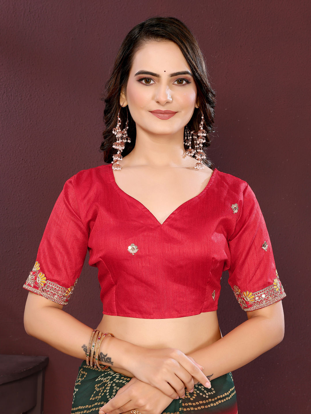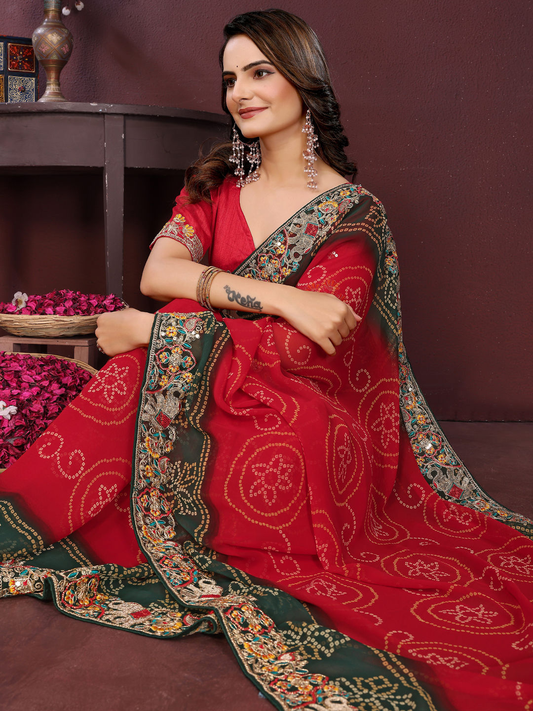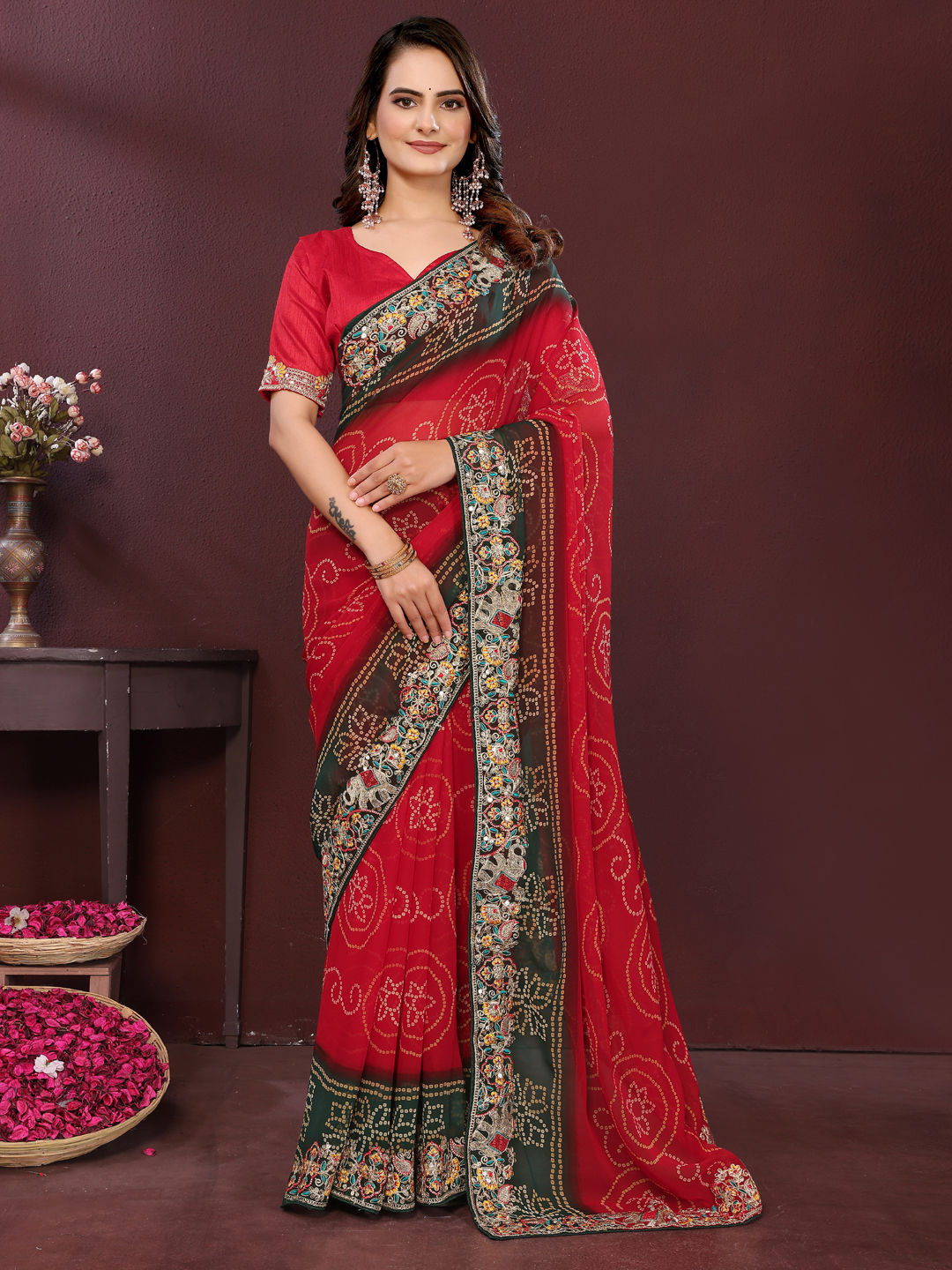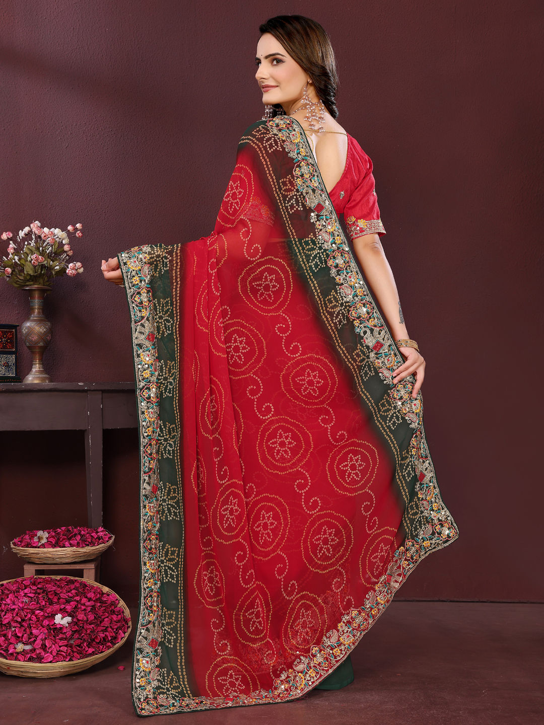 Red and Maroon color Saree in Georgette fabric with Bandhej, Digital Print, Embroidered work