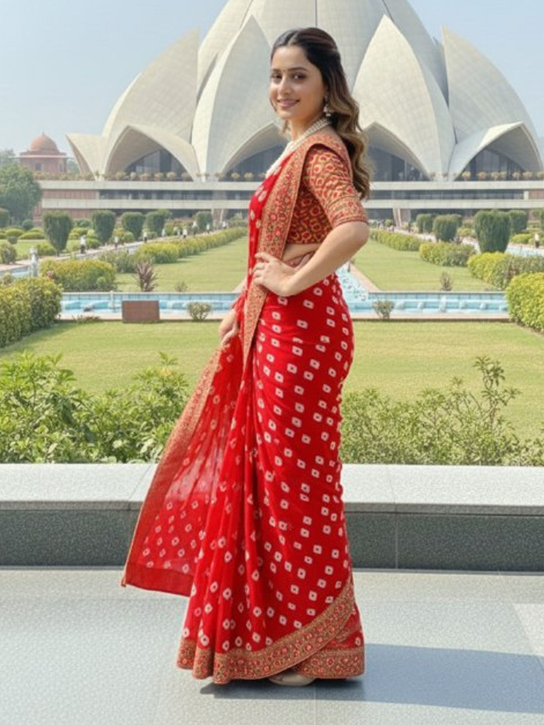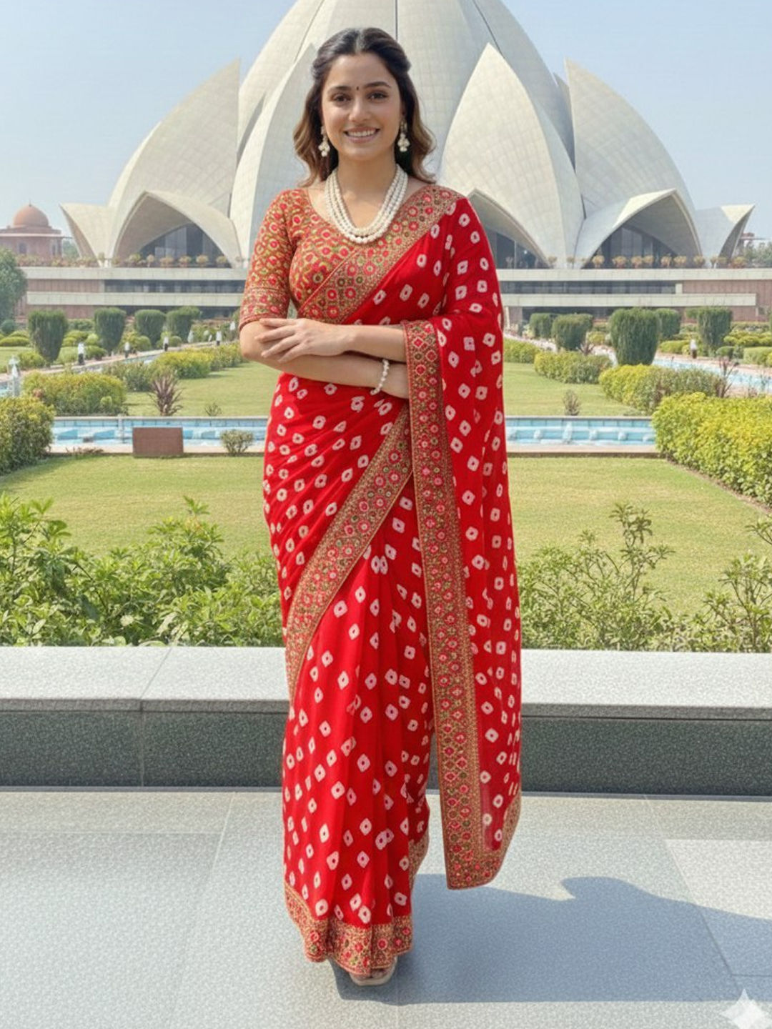 Red and Maroon color Saree in Georgette fabric with Bandhej, Embroidered, Printed work