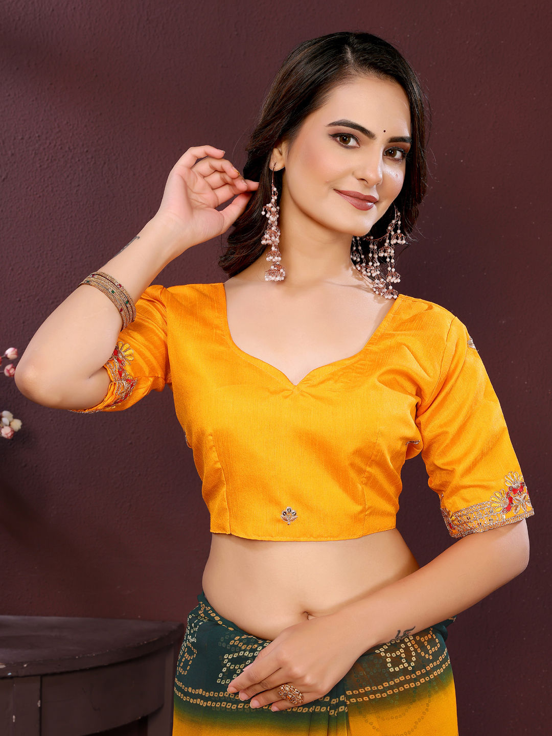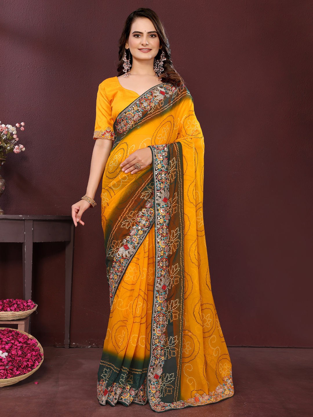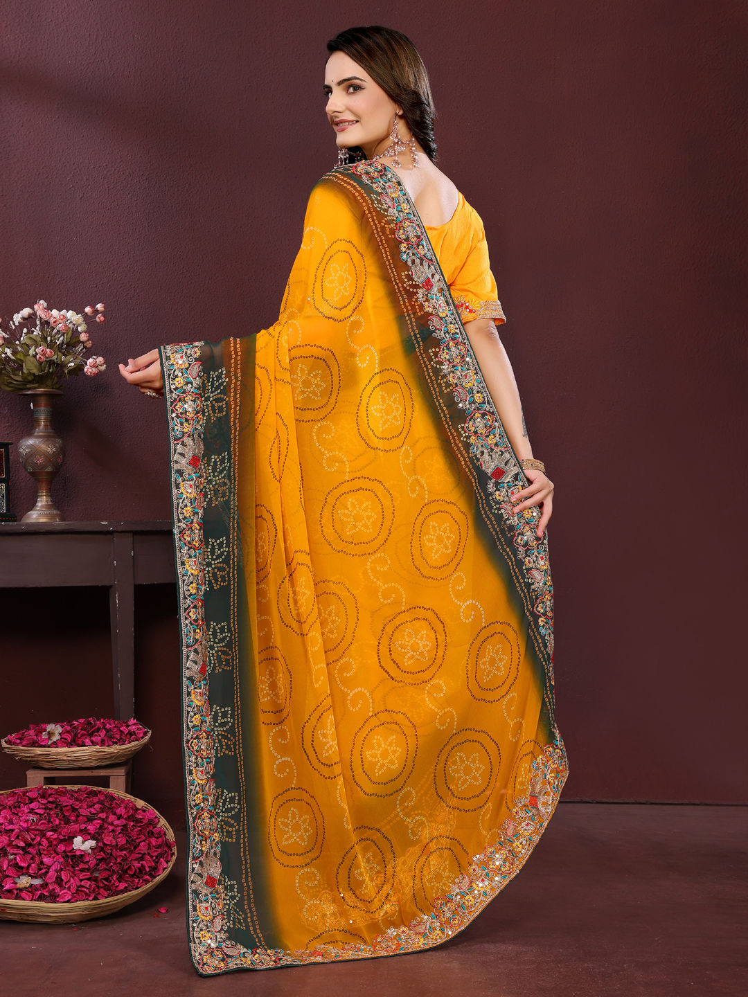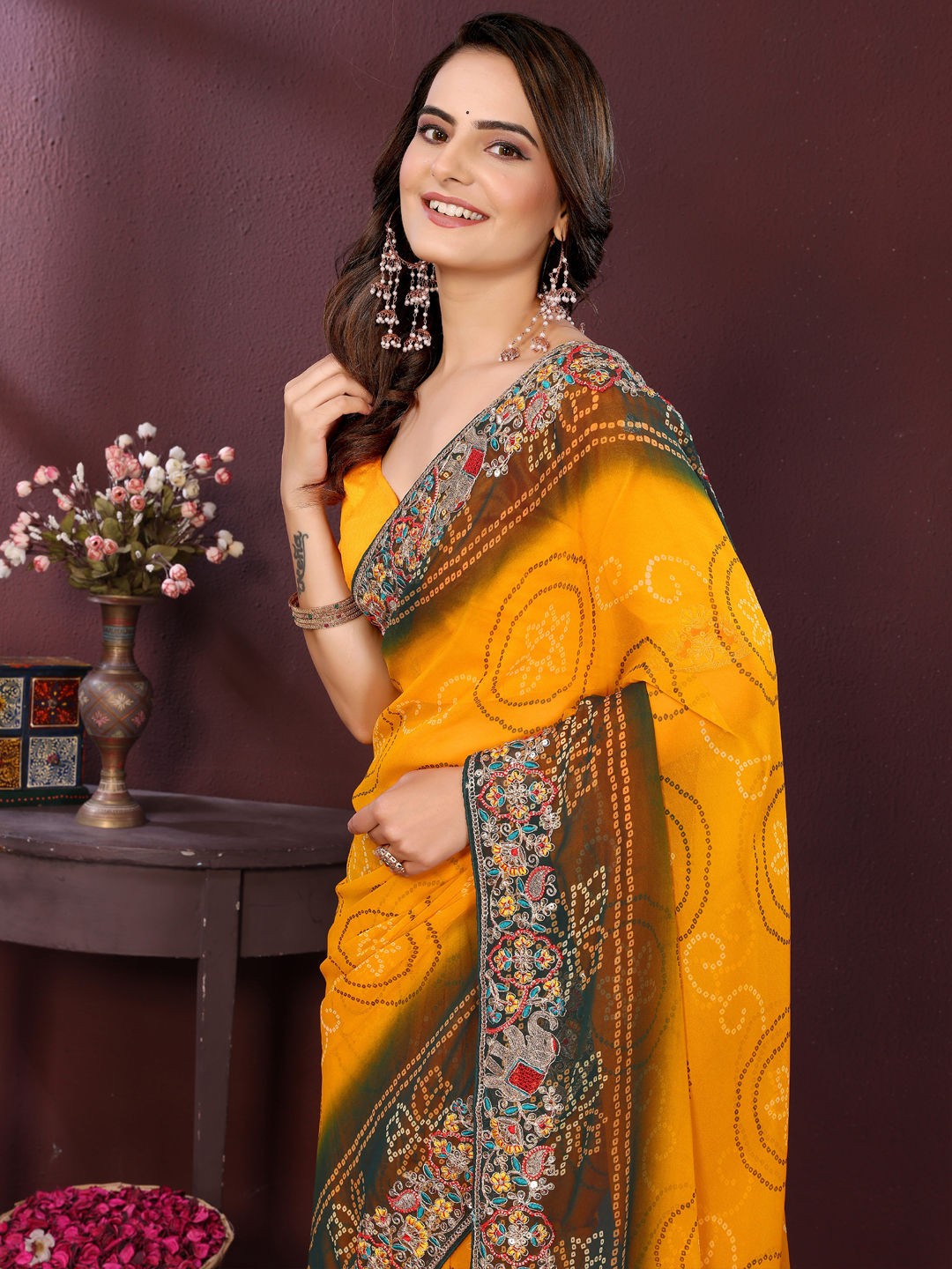 Yellow color Saree in Georgette fabric with Bandhej, Digital Print, Embroidered work
