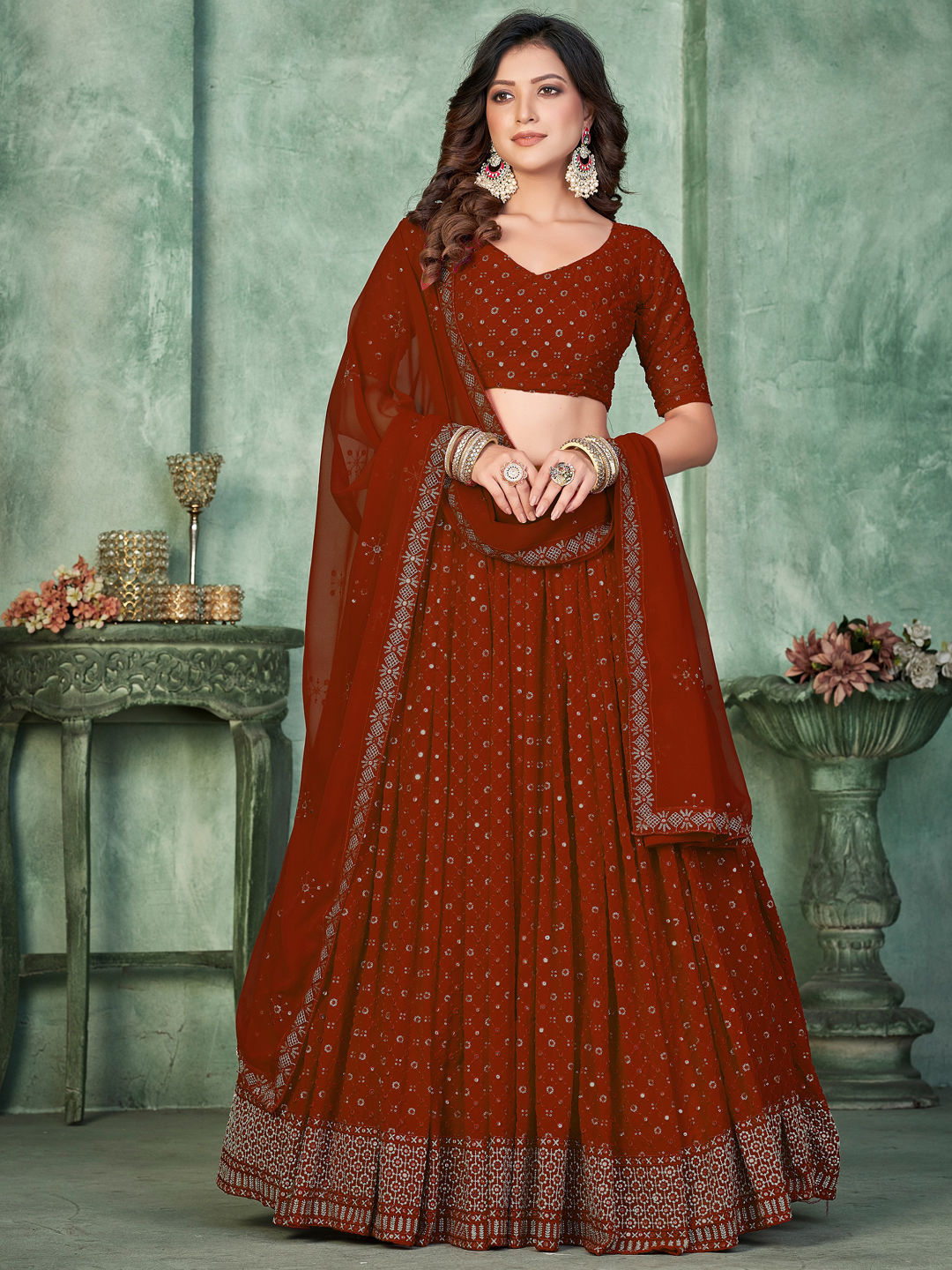 Red and Maroon color Lehenga in Georgette fabric with Embroidered, Sequence, Thread work