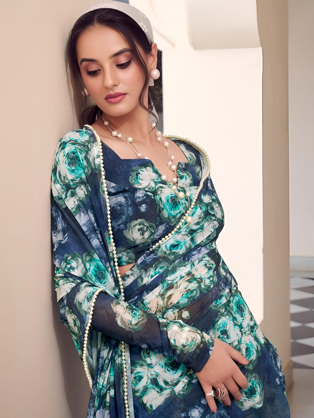 Blue color Readymade Saree in Georgette fabric with Floral, Lace, Moti, Printed work