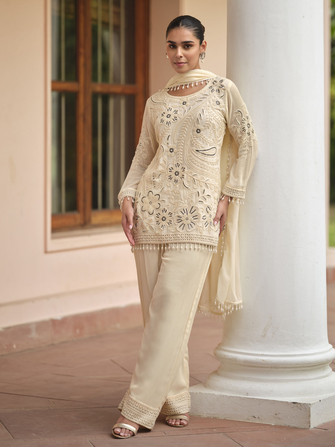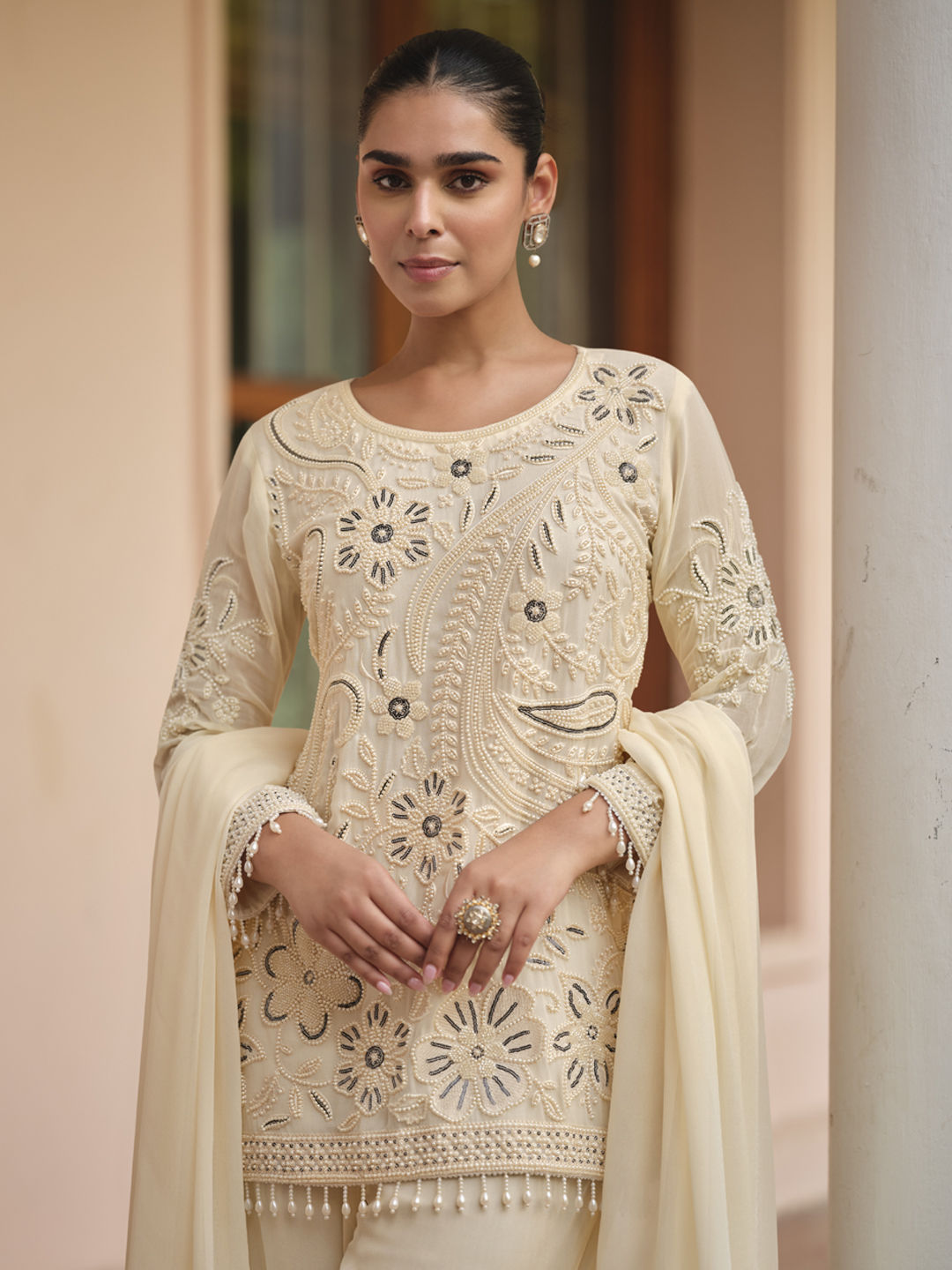 Beige and Brown color Salwar Kameez in Georgette fabric with Moti, Sequence work