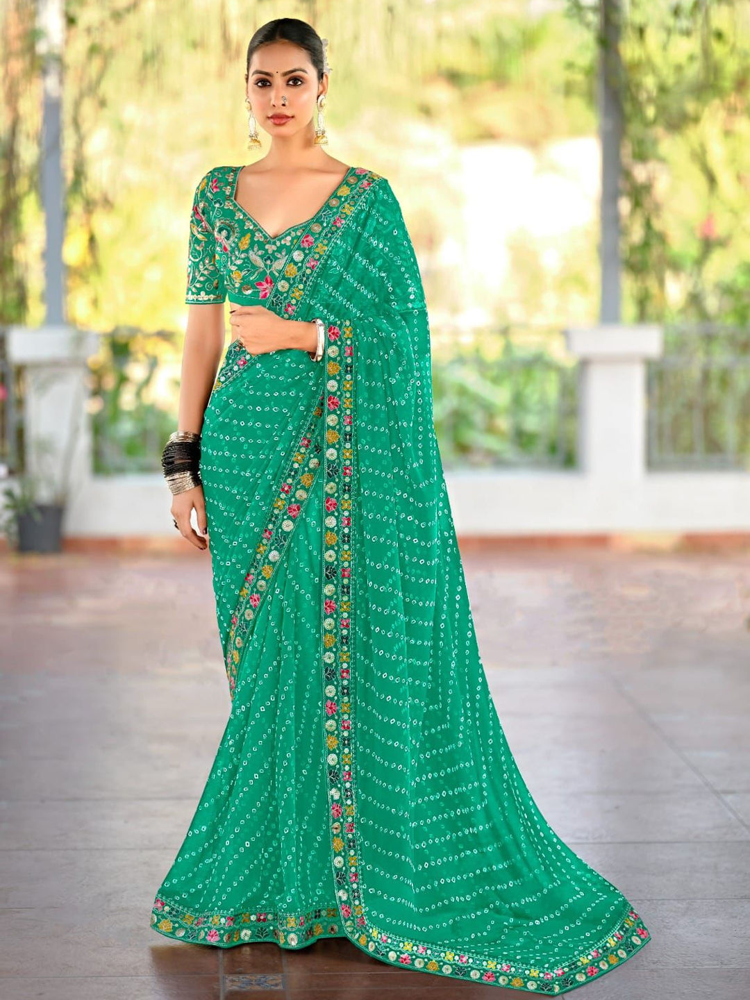 Green color Saree in Georgette fabric with Bandhej, Printed, Sequence work