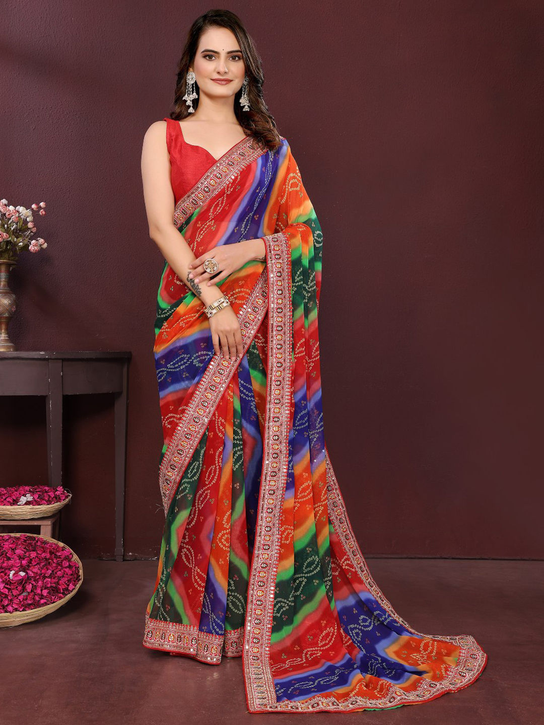 Georgette Festive Saree in Multicolor with Bandhej work