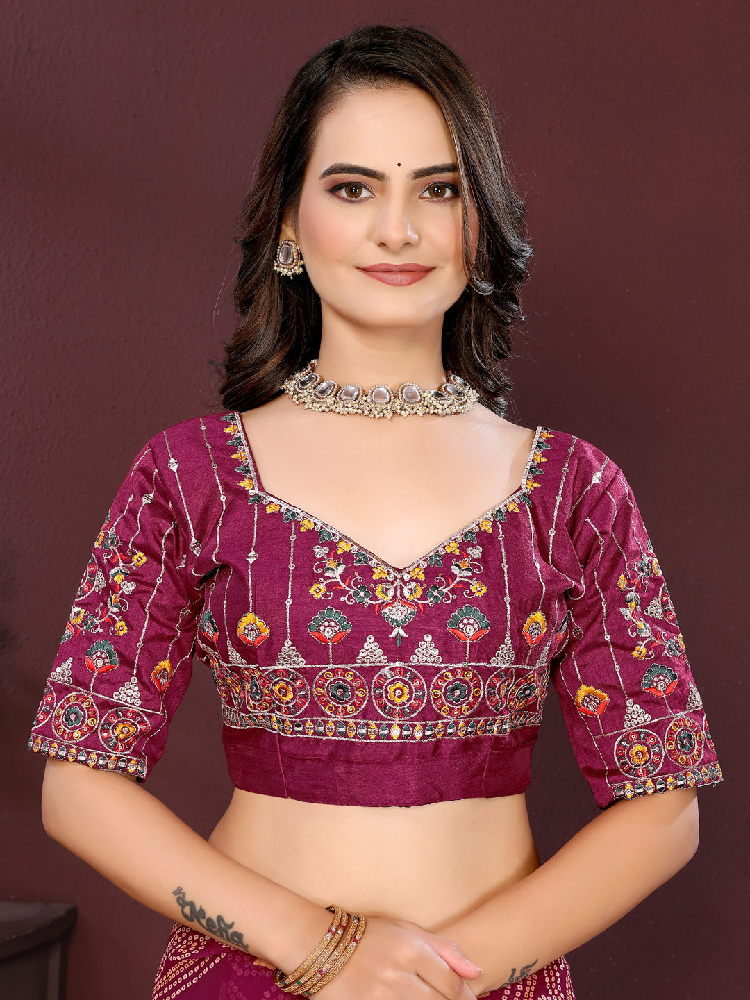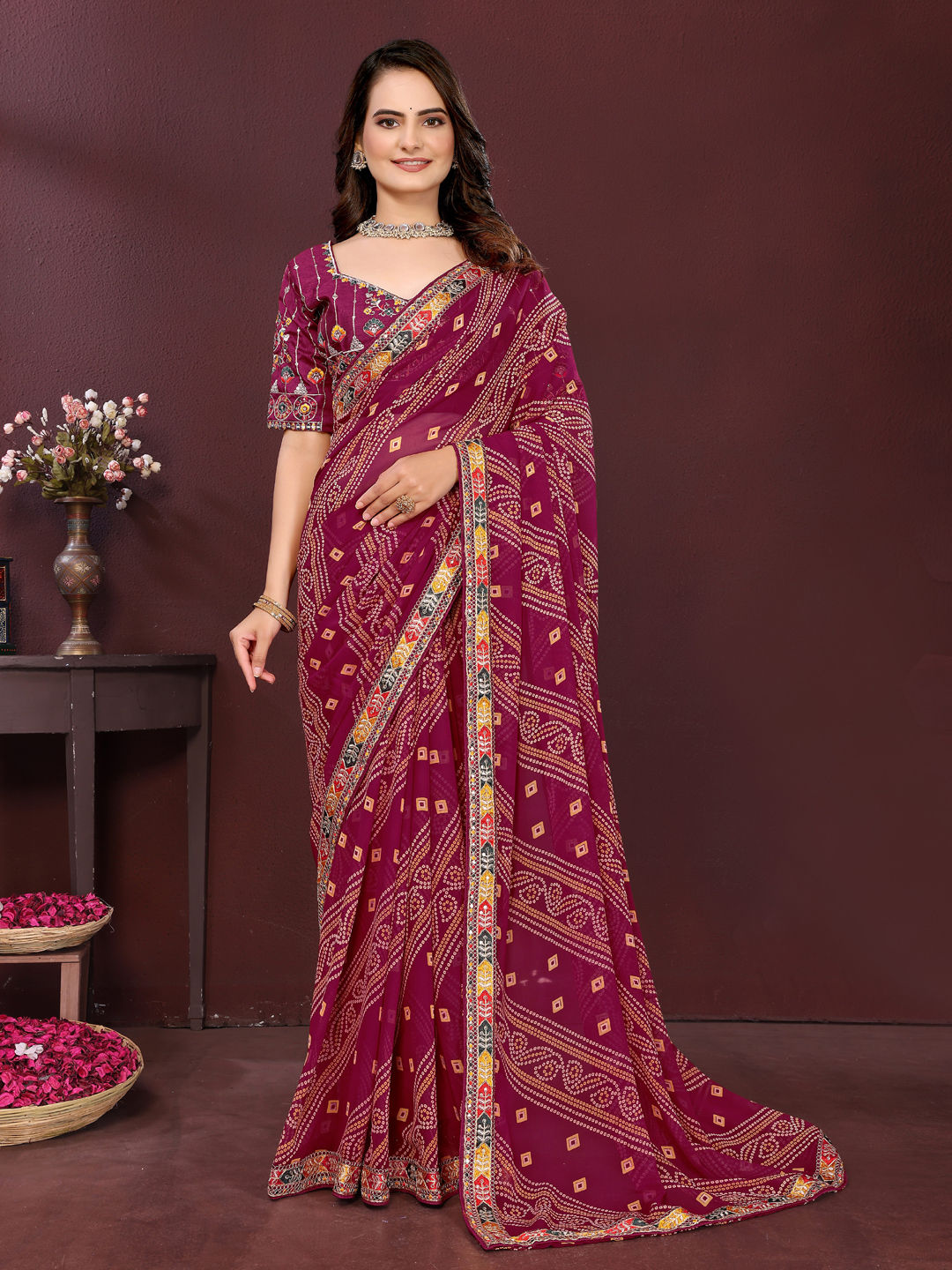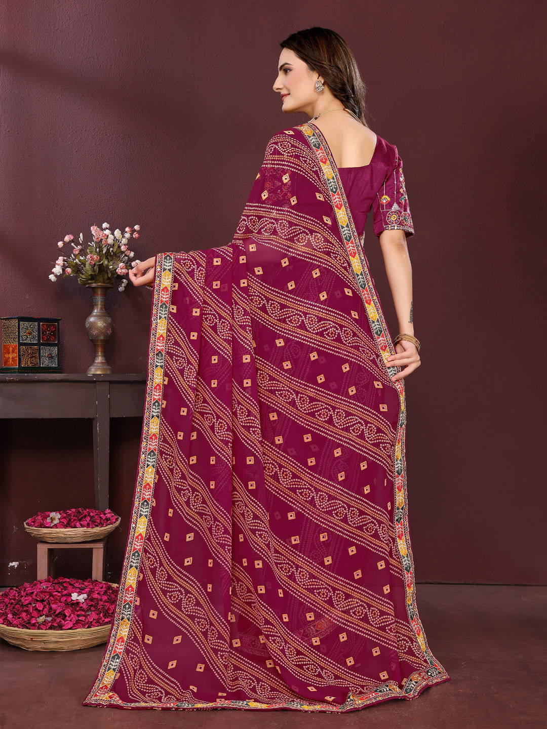 Purple and Violet color Saree in Georgette fabric with Bandhej, Border, Digital Print, Embroidered work