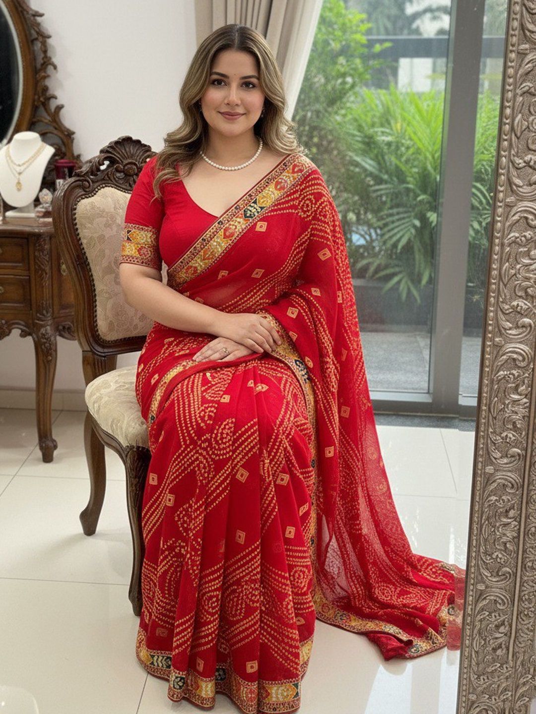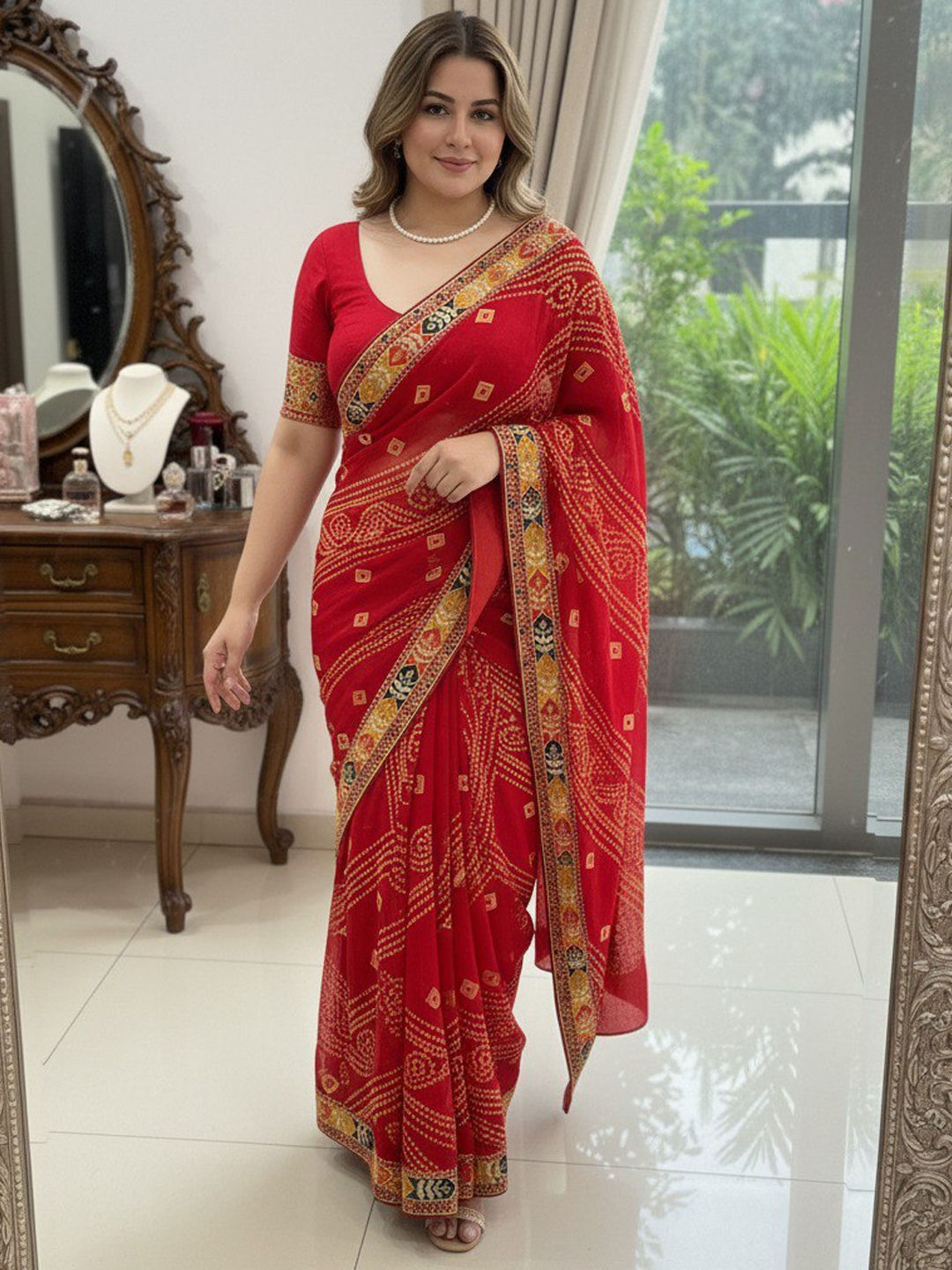 Red and Maroon color Saree in Georgette fabric with Bandhej, Digital Print, Embroidered work