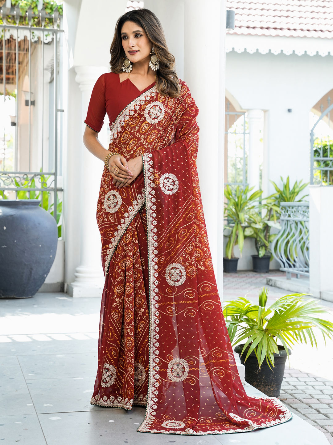 Red and Maroon color Saree in Georgette fabric with Bandhej, Embroidered, Lace, Printed, Thread, Zari work