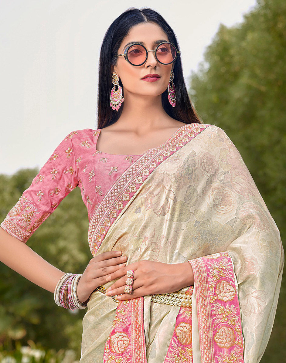 White and Off White color Saree in Georgette fabric with Border, Floral, Printed work