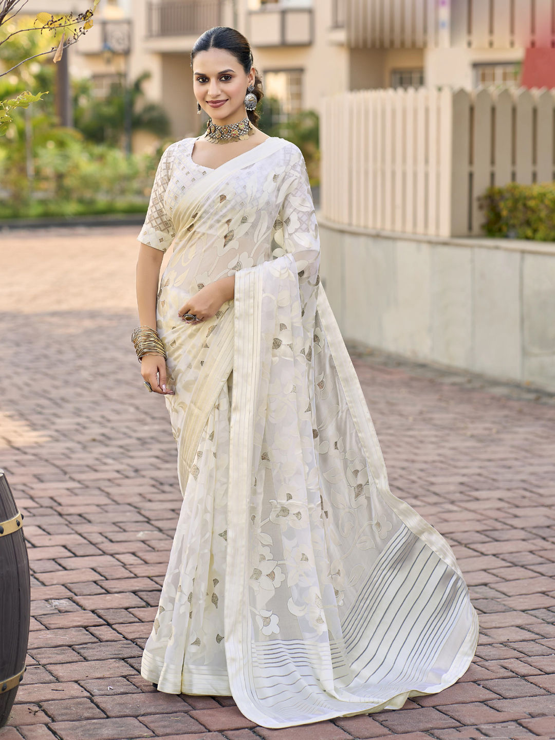 White and Off White color Saree in Georgette fabric with Floral, Printed, Weaving work