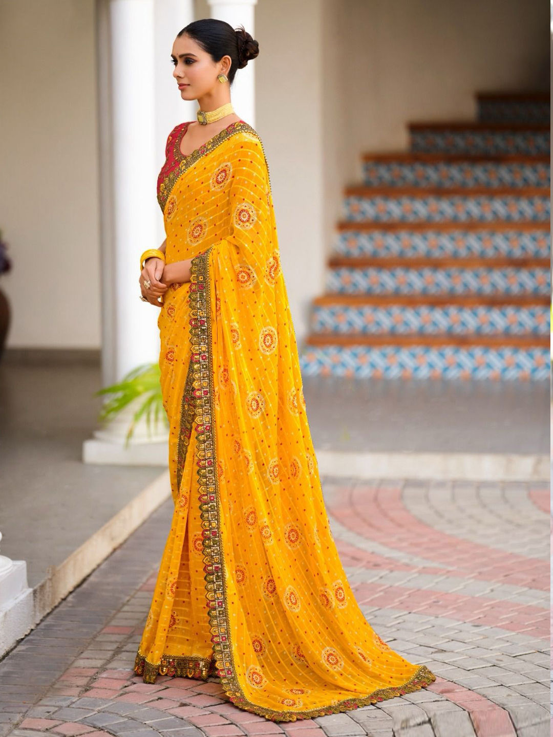Yellow color Saree in Georgette fabric with Embroidered, Printed, Sequence, Thread work
