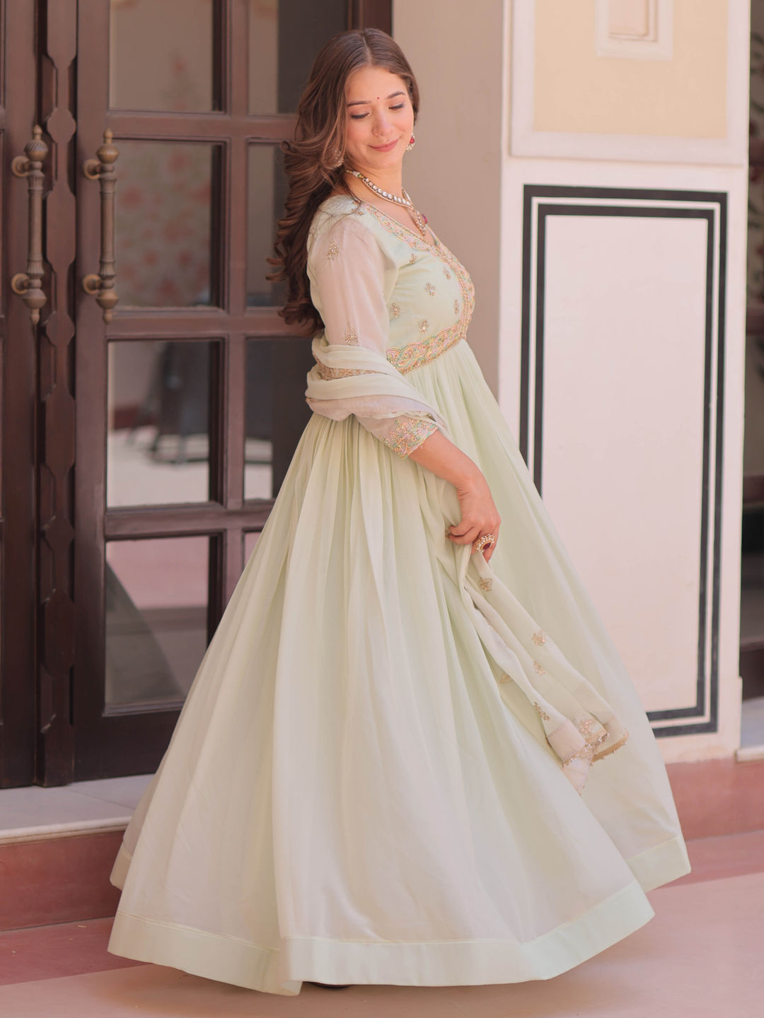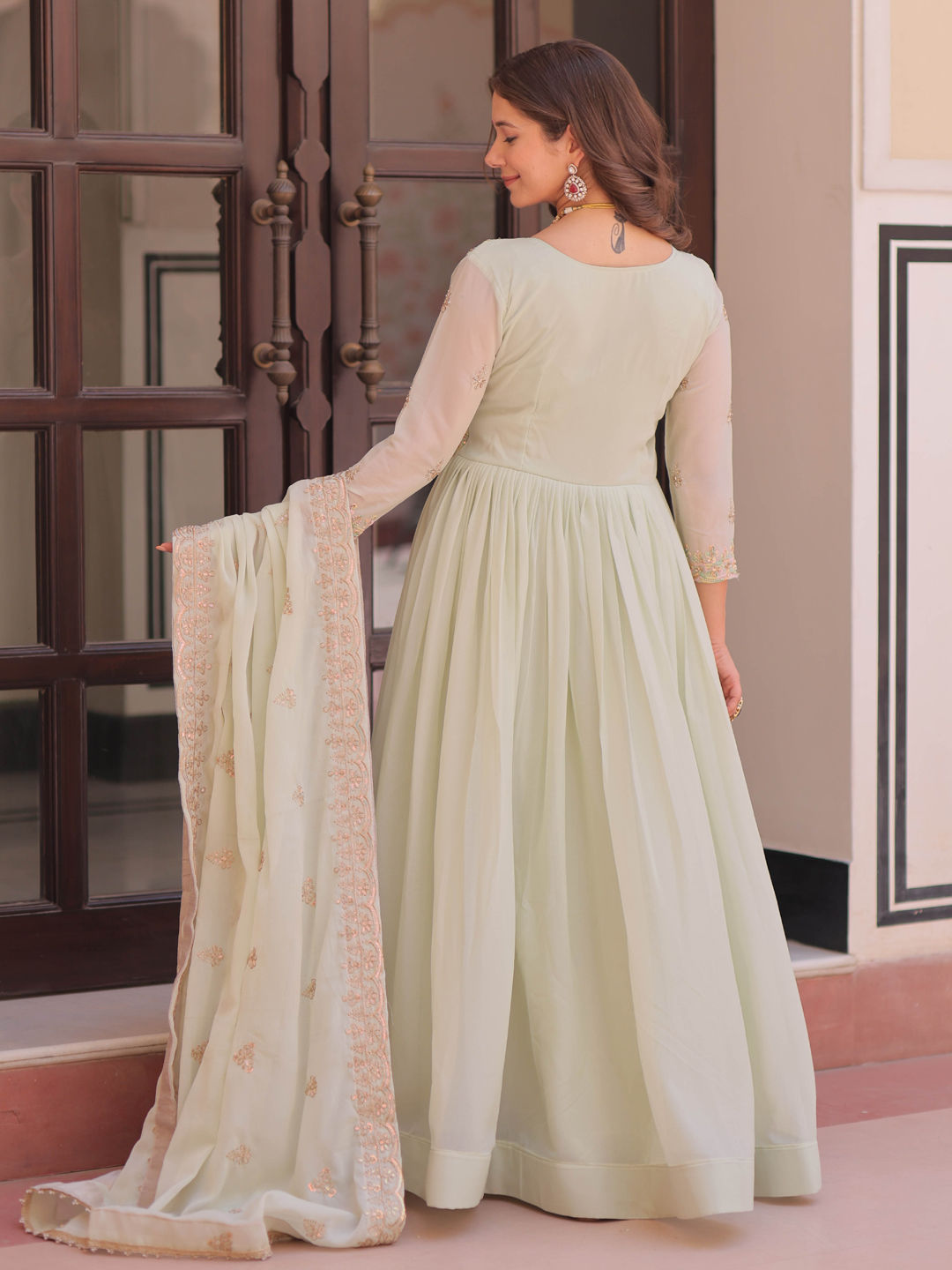 Green color Gown in Georgette fabric with Embroidered, Sequence work