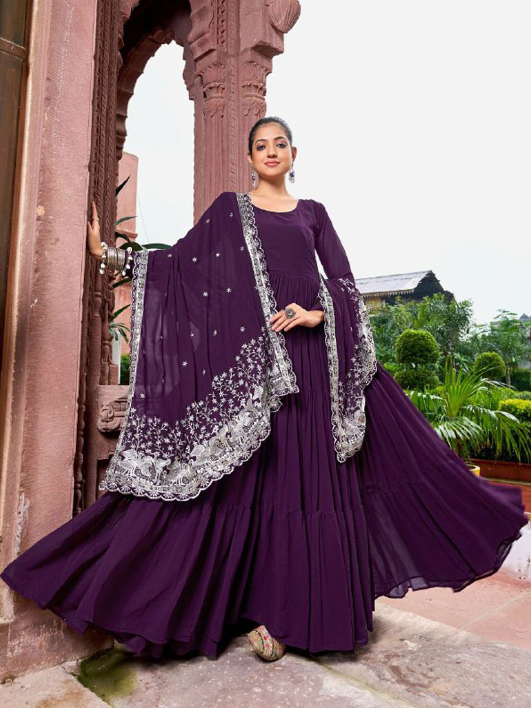 Purple and Violet color Gown in Georgette fabric with Embroidered, Sequence work