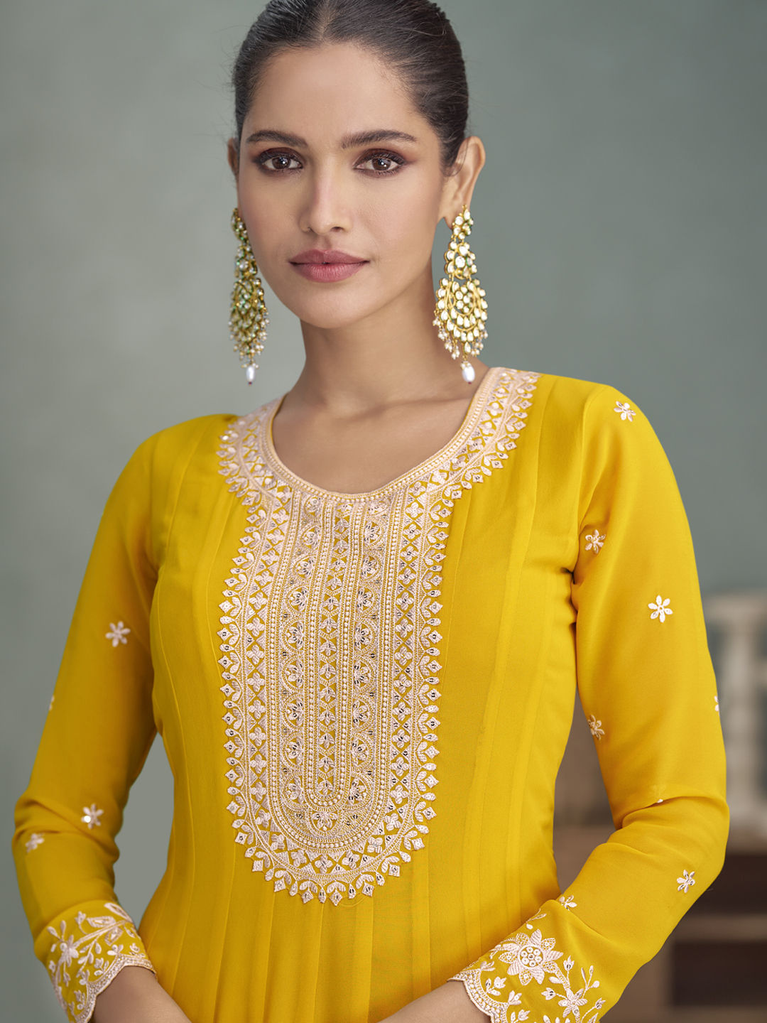Yellow color Gown in Georgette fabric with Embroidered, Thread work