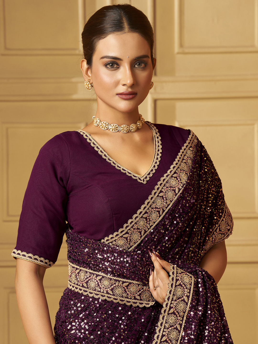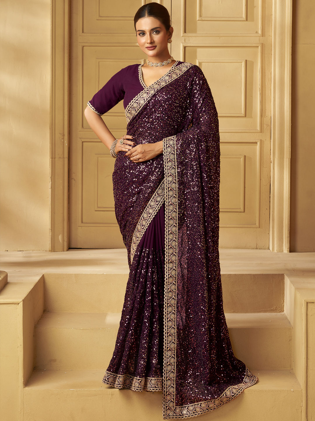 Purple and Violet color Readymade Saree in Georgette fabric with Stone, Thread work