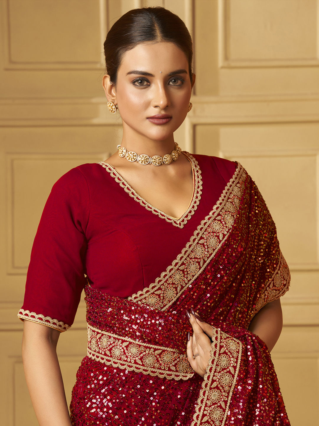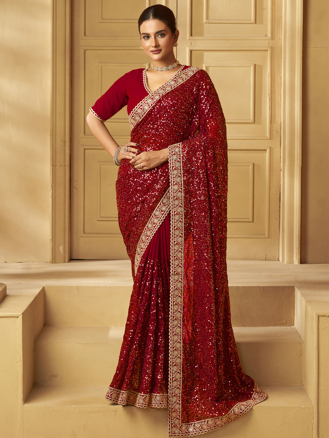 Red and Maroon color Readymade Saree in Georgette fabric with Stone, Thread work