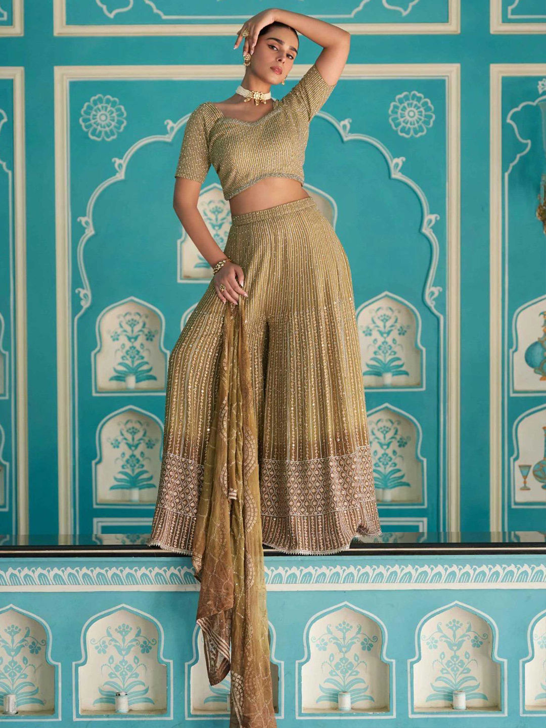 Gold color Salwar Kameez in Georgette fabric with Embroidered, Sequence, Weaving, Zari work