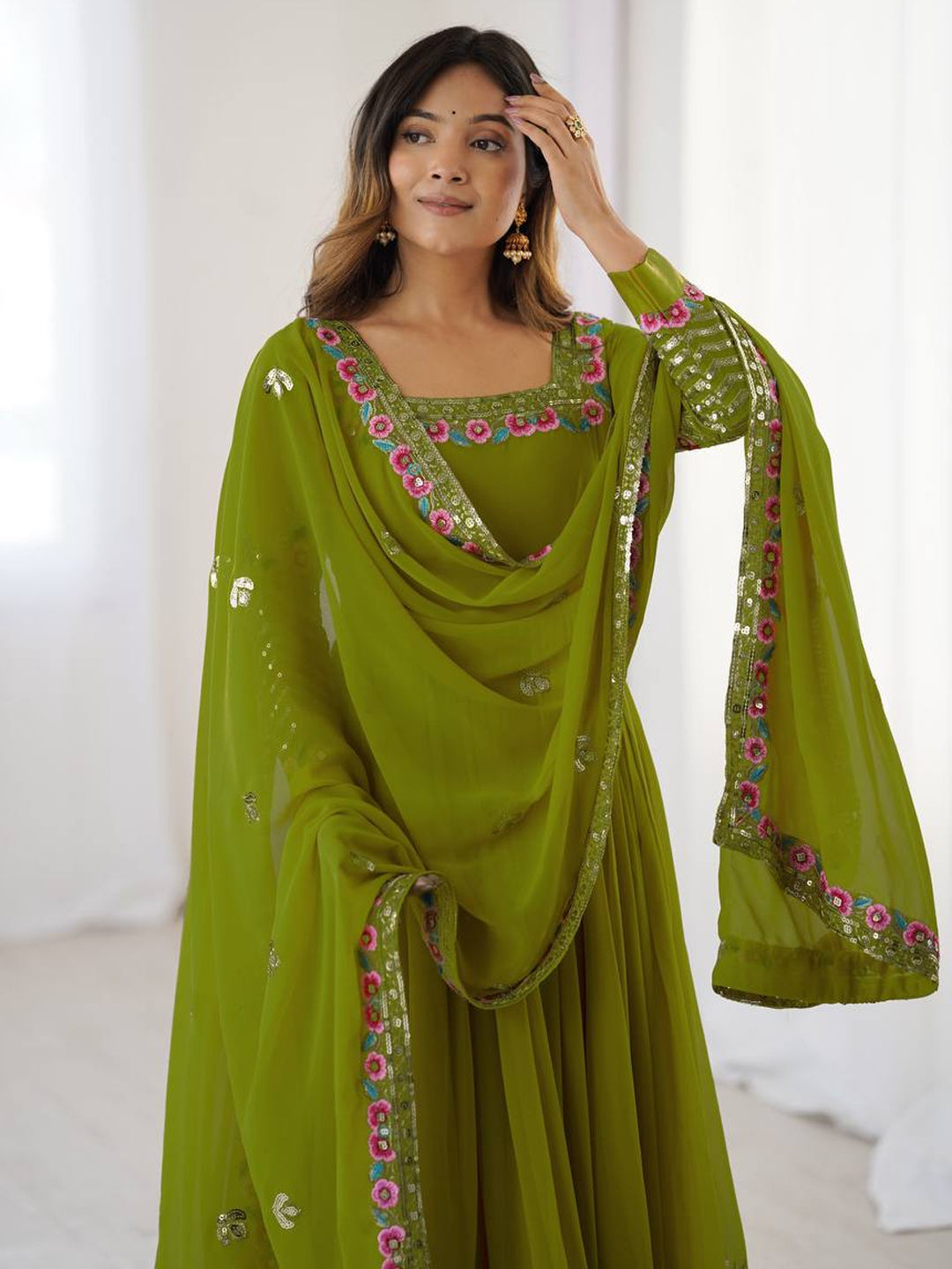 Green color Salwar Kameez in Georgette fabric with Embroidered, Sequence, Thread work