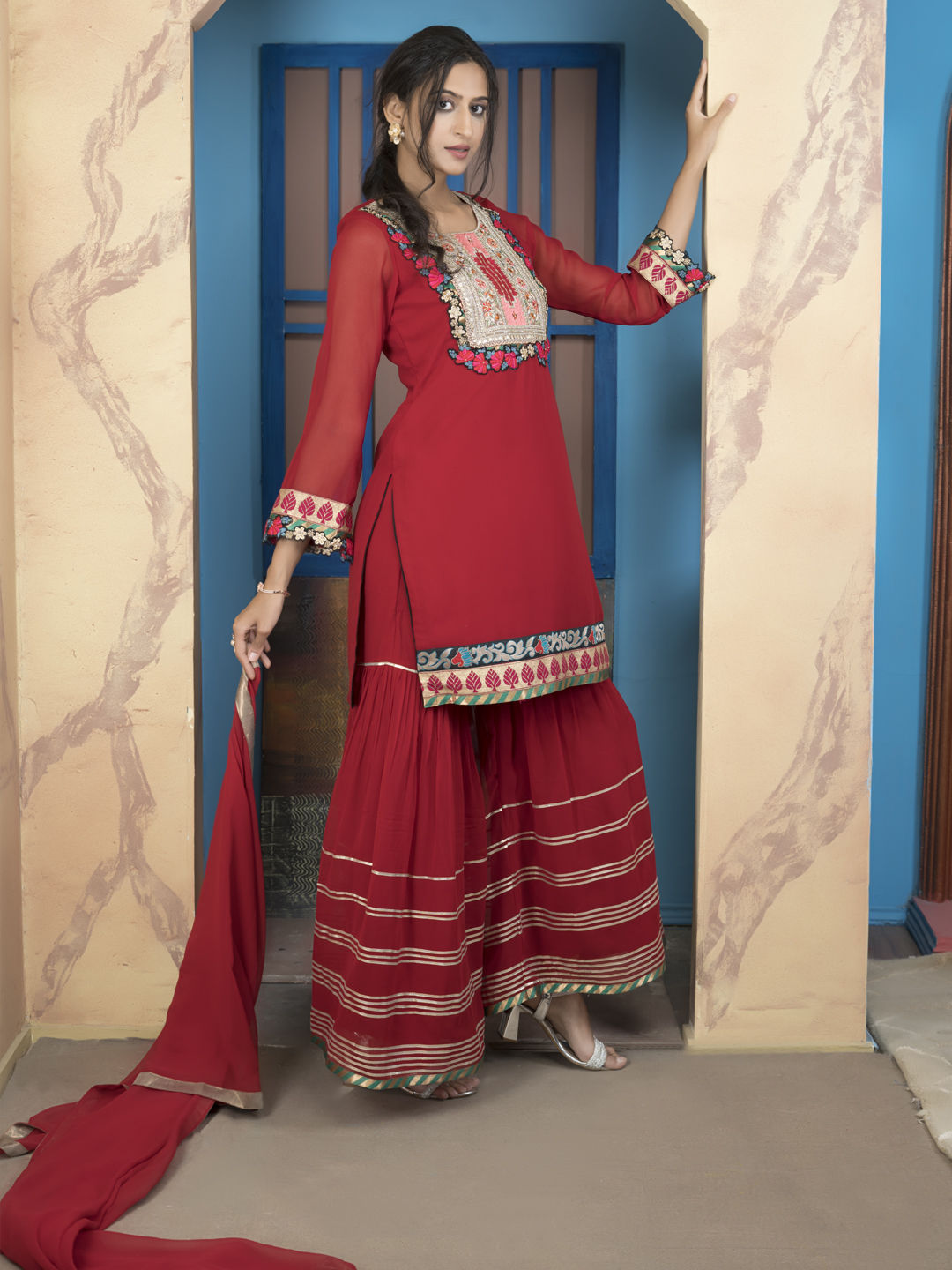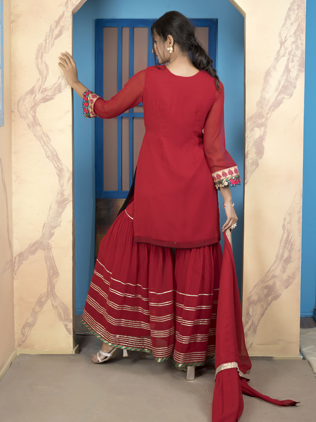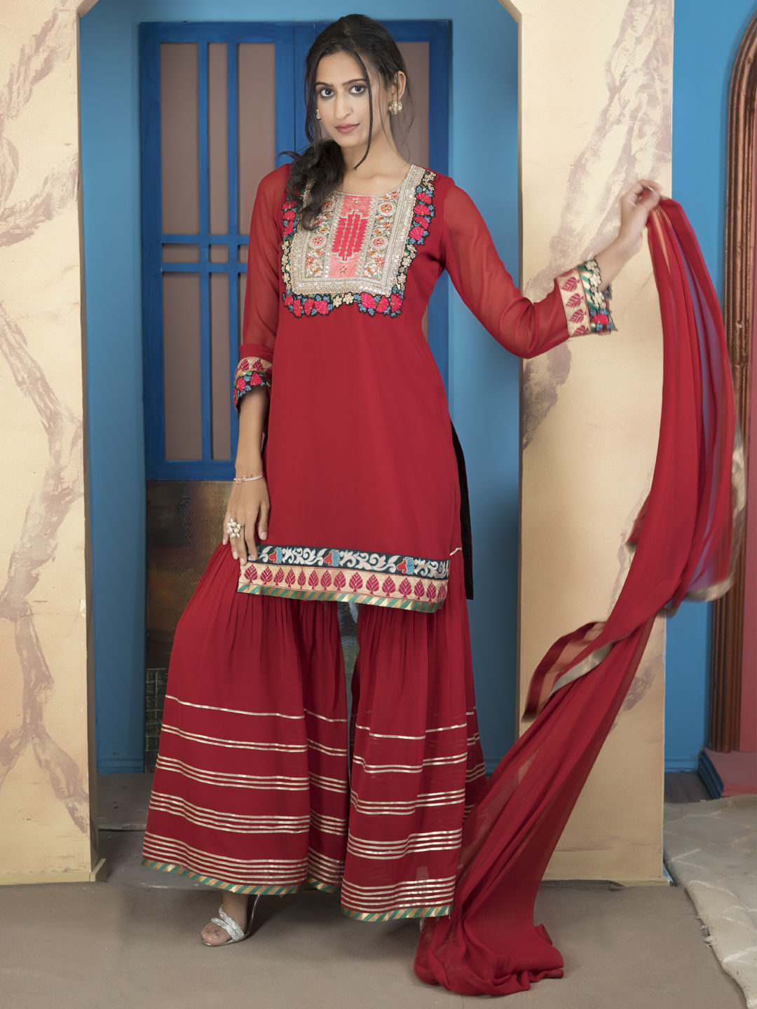 in Red and Maroon with Thread work