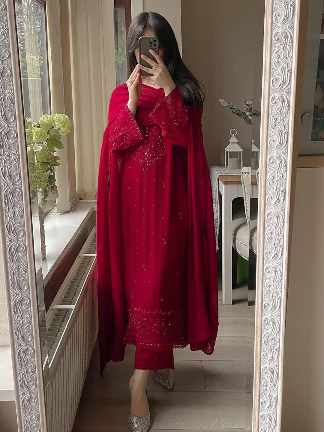 Red and Maroon color Salwar Kameez in Georgette fabric with Embroidered, Sequence, Thread work