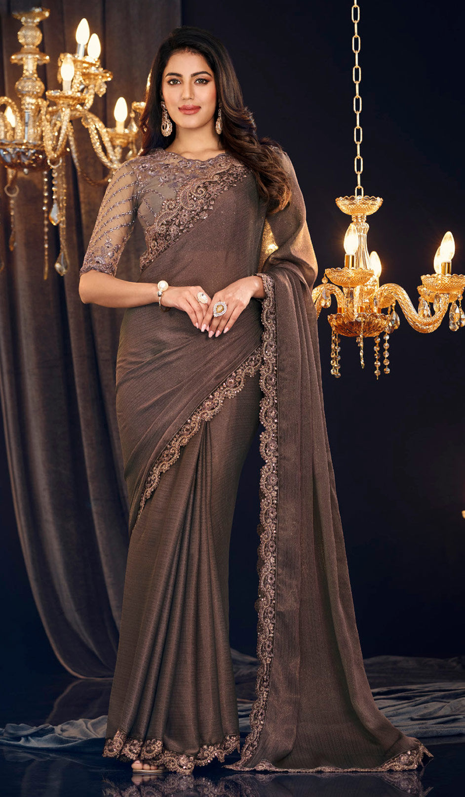 Beige and Brown color Saree in Georgette fabric with Embroidered, Resham, Sequence, Thread work