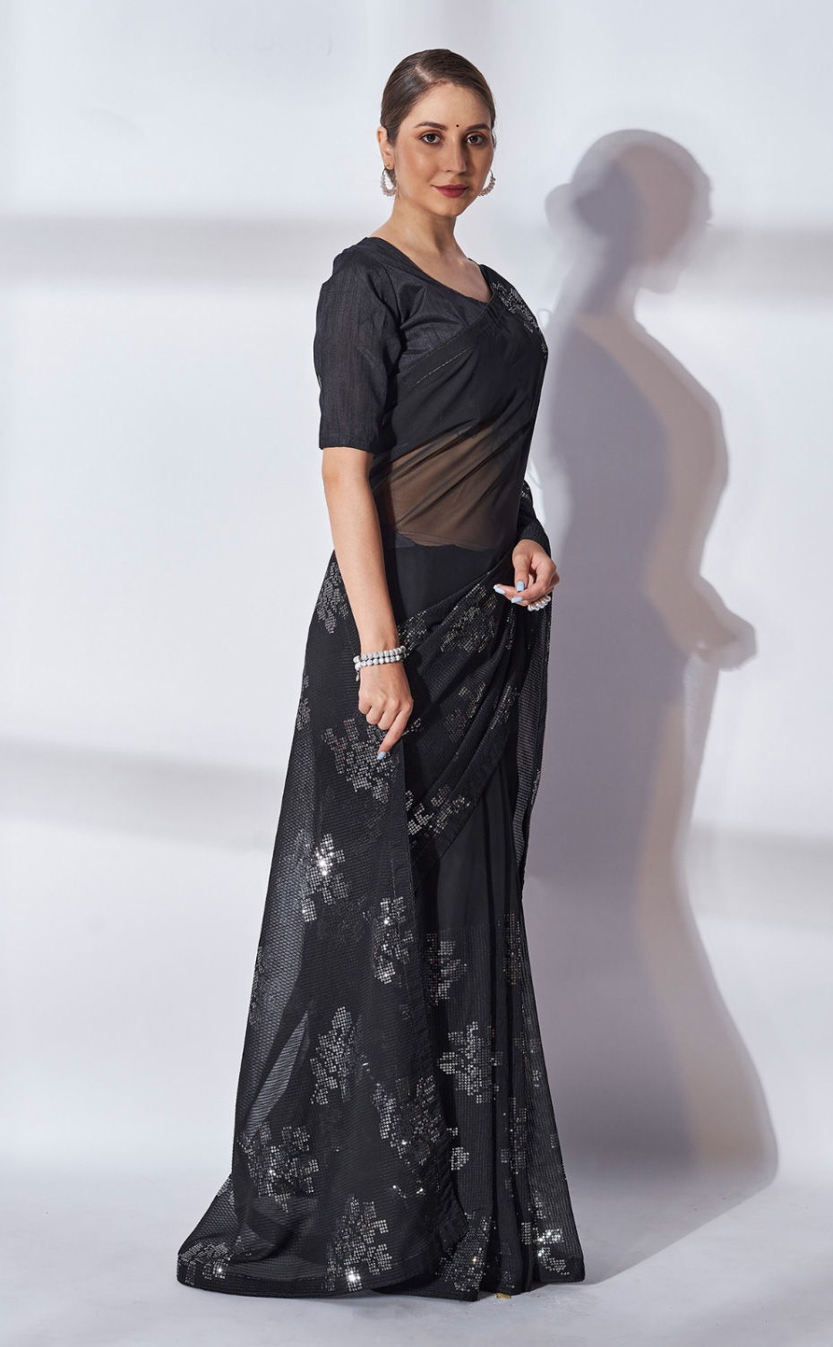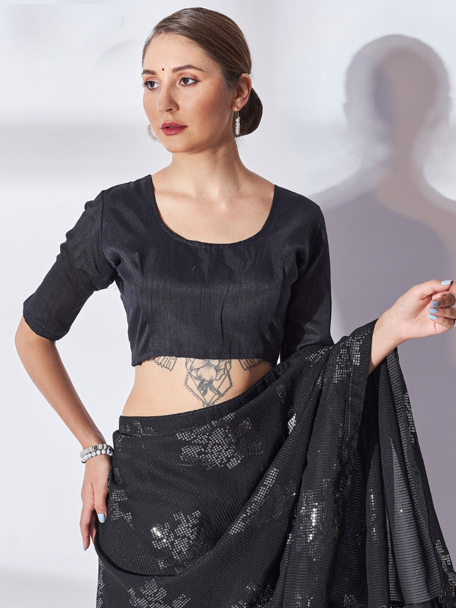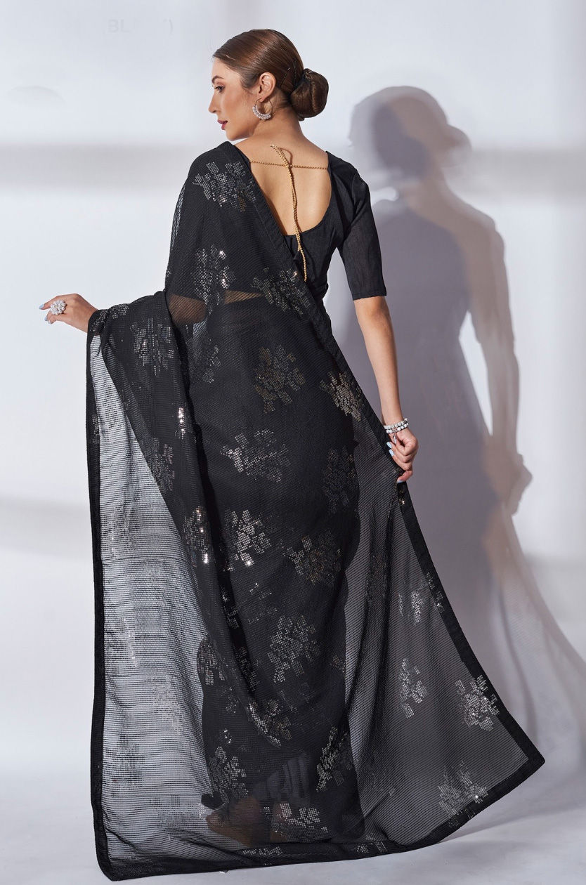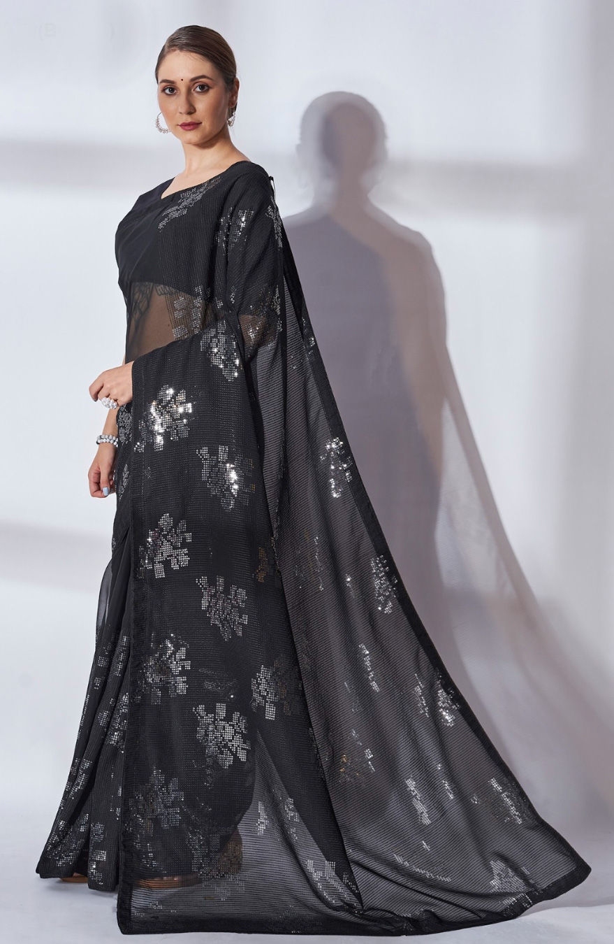 Black and Grey color Saree in Georgette fabric with Sequence work