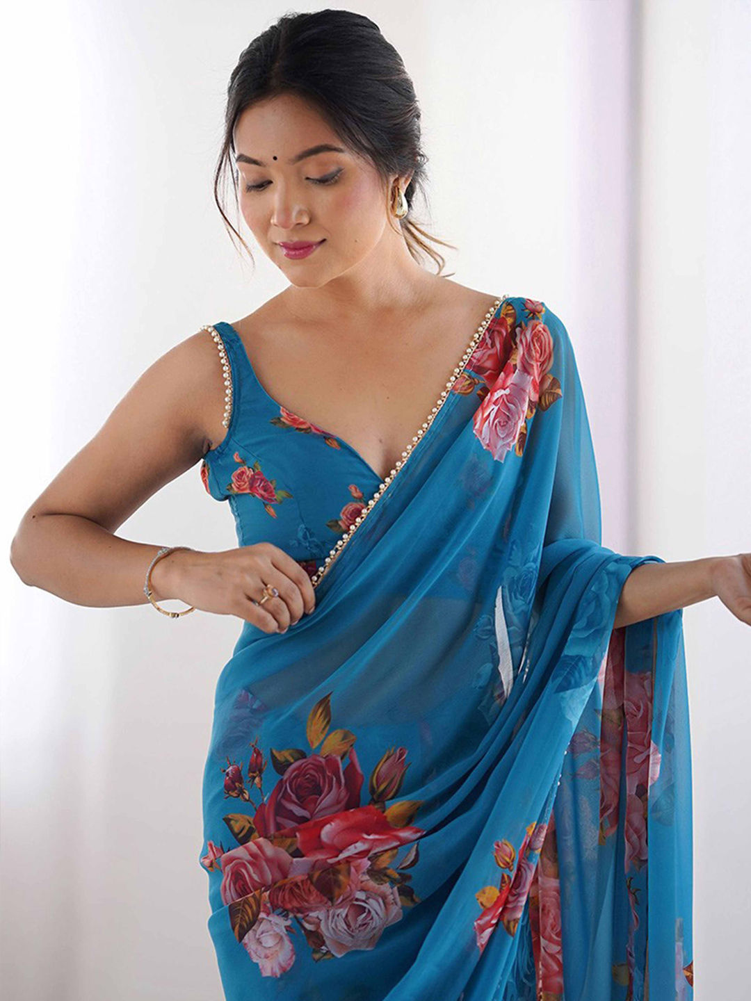 Blue color Saree in Georgette fabric with Floral, Lace, Printed work