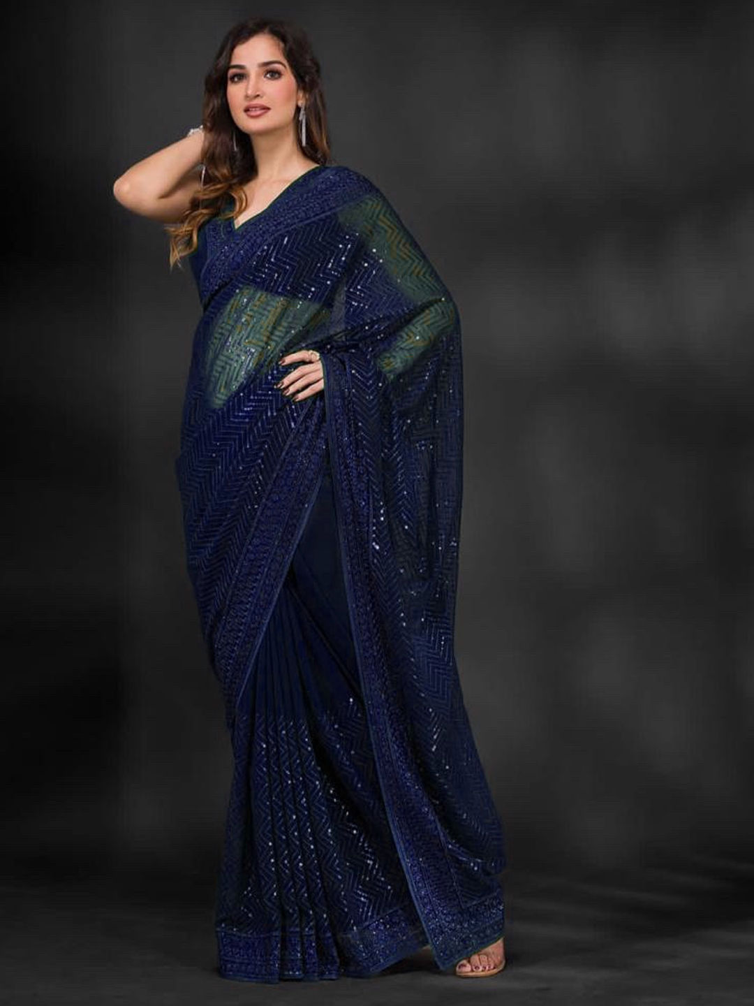 Blue color Saree in Georgette fabric with Embroidered, Sequence, Thread work