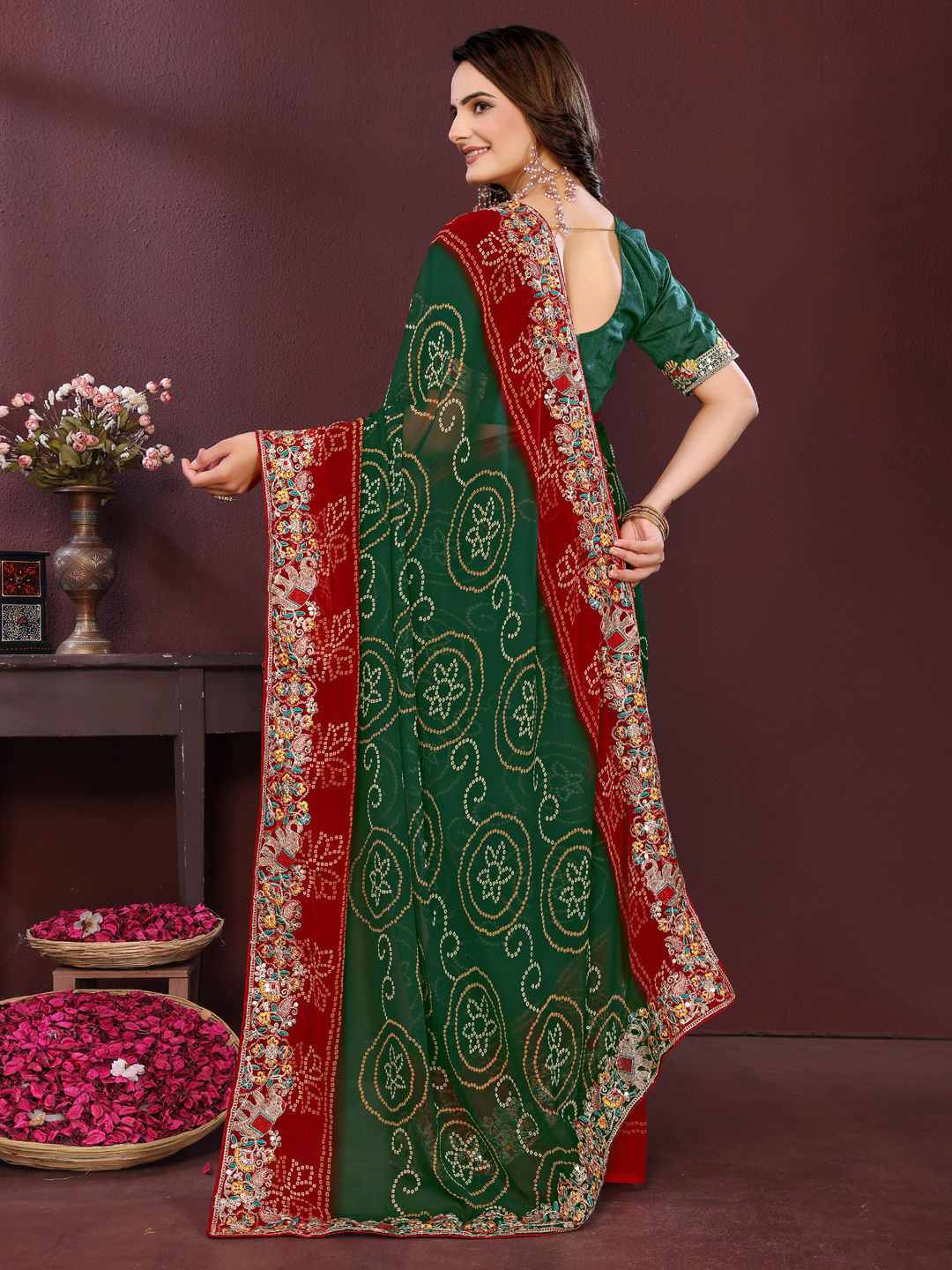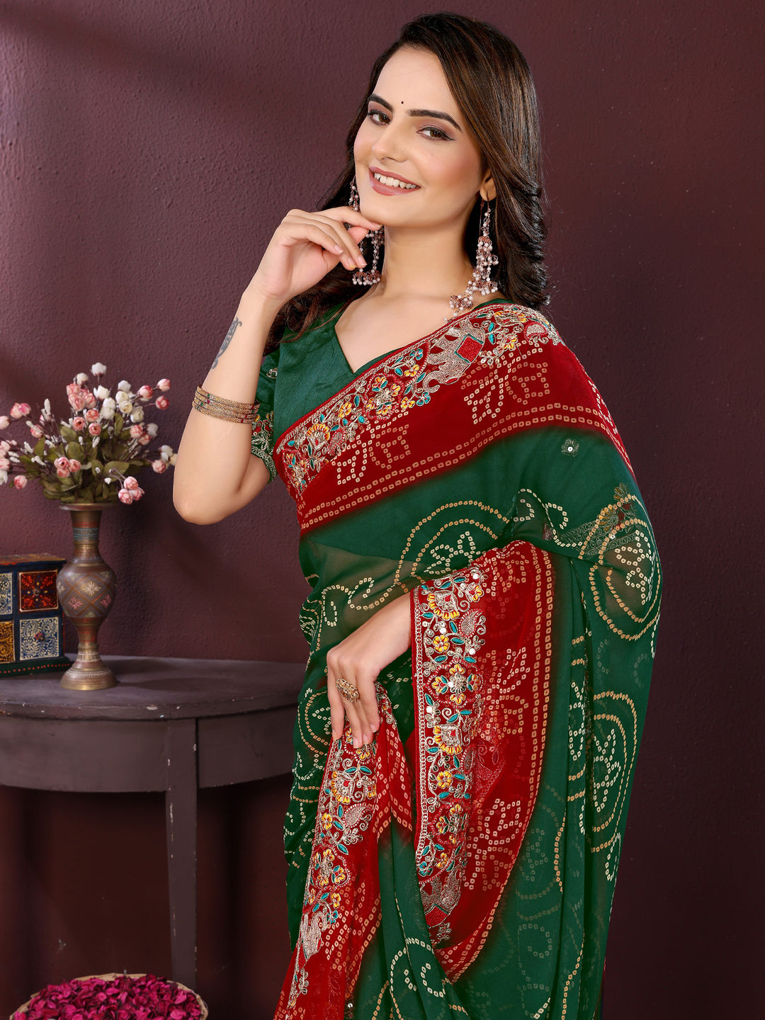 Georgette Festive Saree in Red and Maroon with Bandhej work