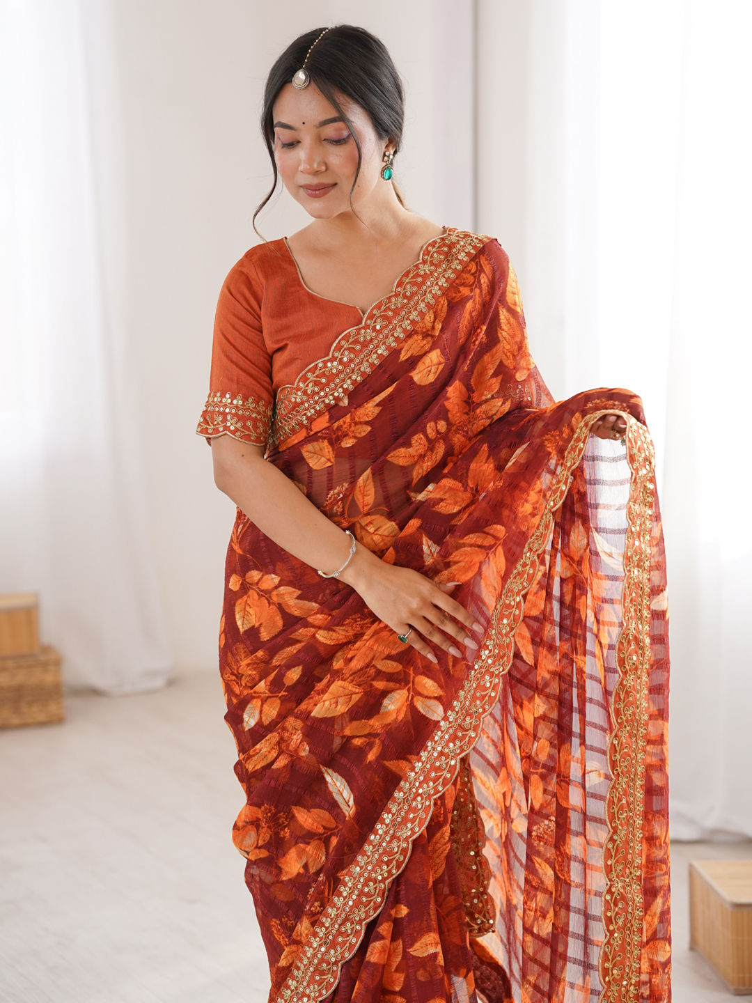 Orange color Saree in Georgette fabric with Embroidered, Floral, Printed work